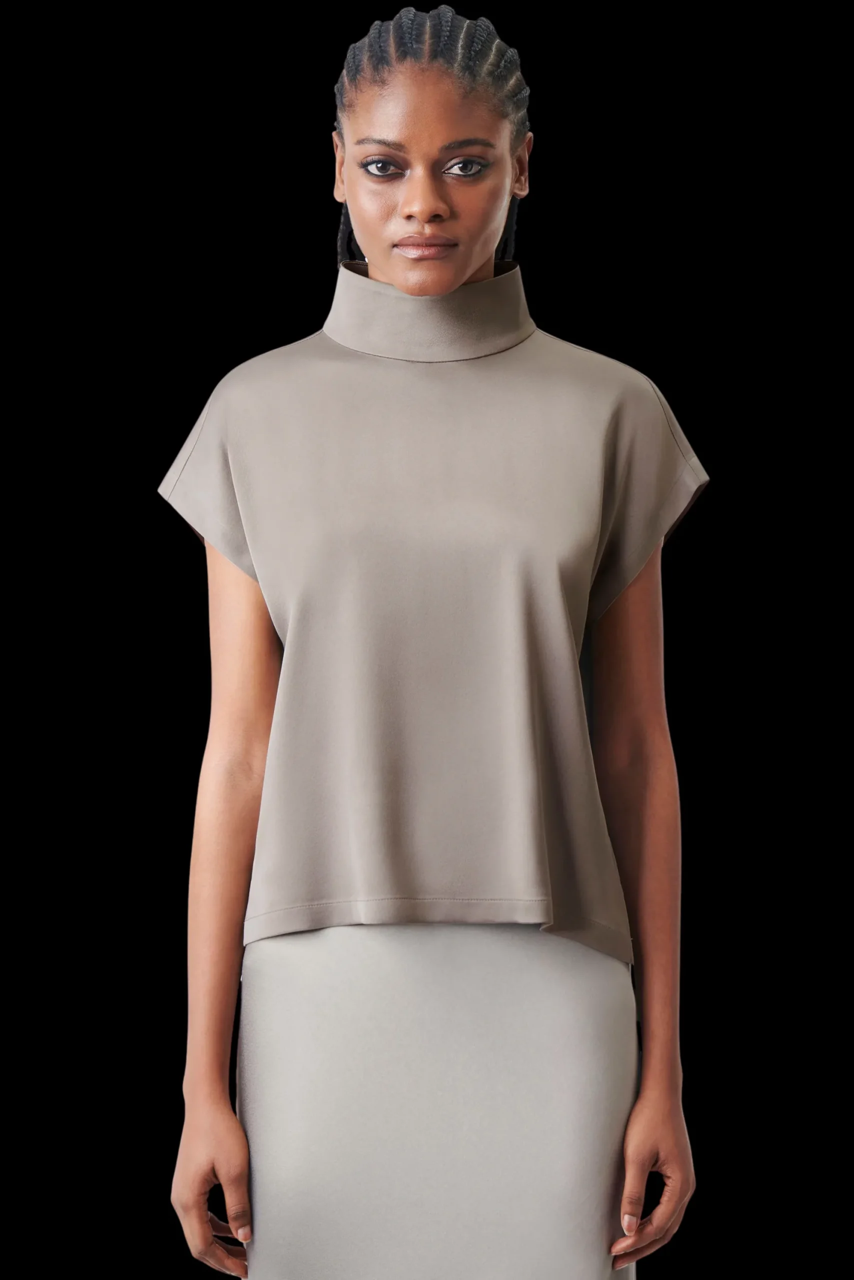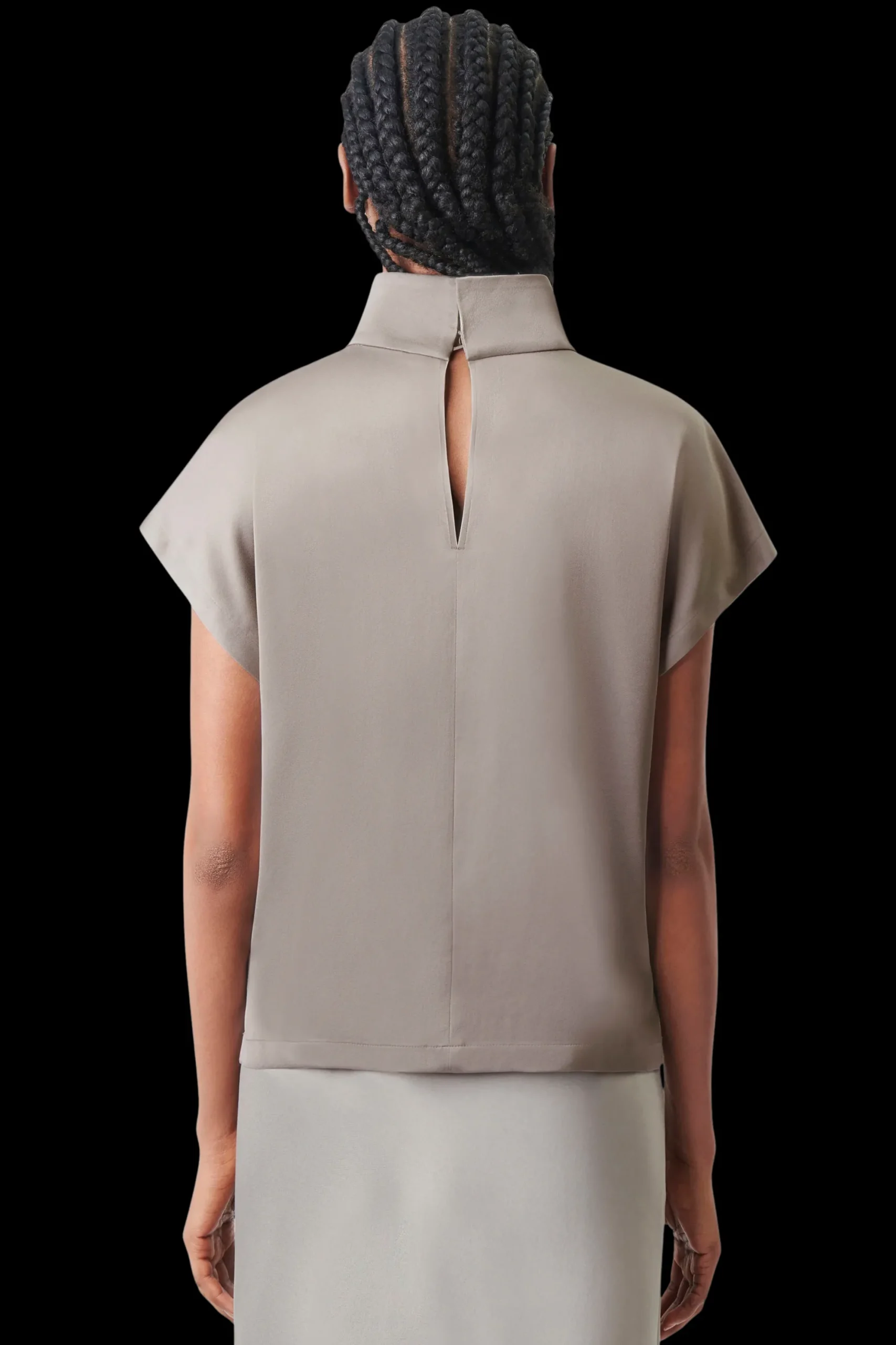 ALARIA_1 is een overhemdblouse in een ontspannen pasvorm en H-lijn. De blouse heeft korte overgesneden mouwen, een opstaande kraag en knoopsluiting. Gemaakt van delicaat satijn.