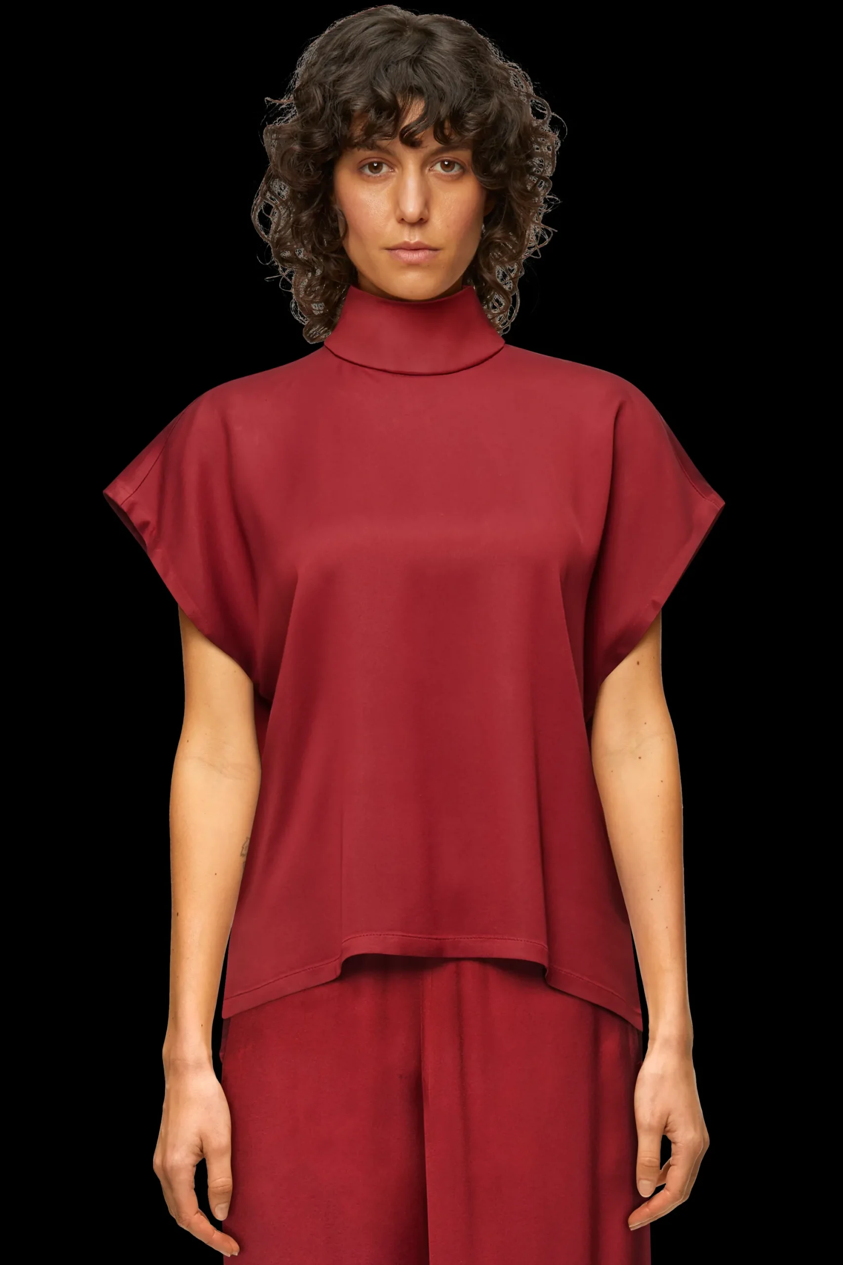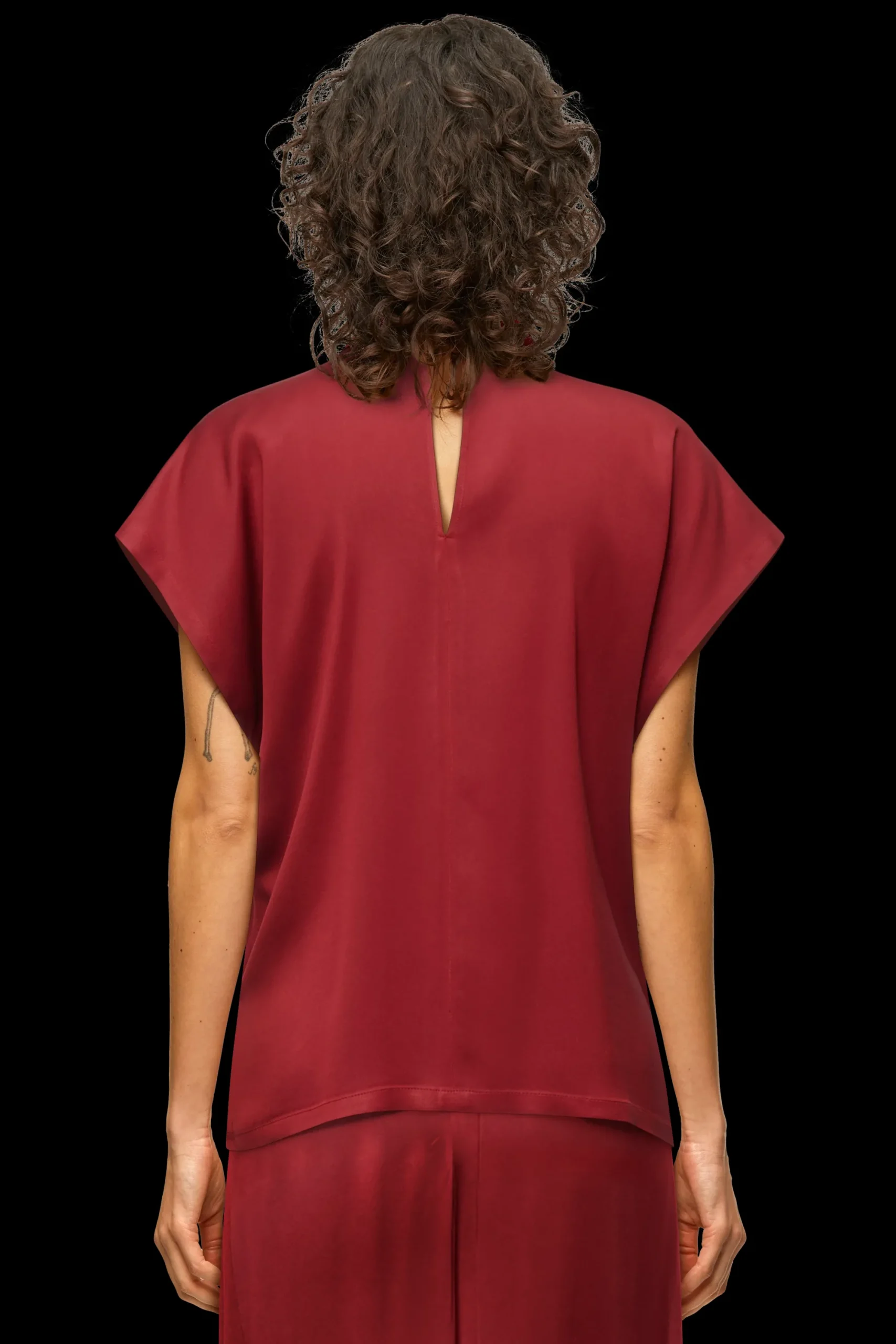 ALARIA_1 is een overhemdblouse in een ontspannen pasvorm en H-lijn. De blouse heeft korte overgesneden mouwen, een opstaande kraag en knoopsluiting. Gemaakt van een hoogwaardig, vloeiend satijn.