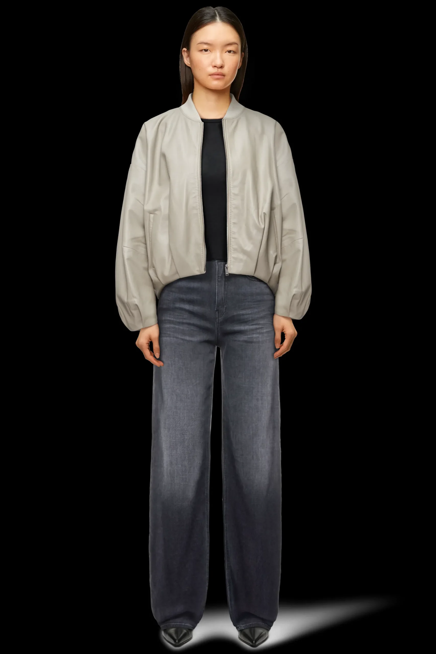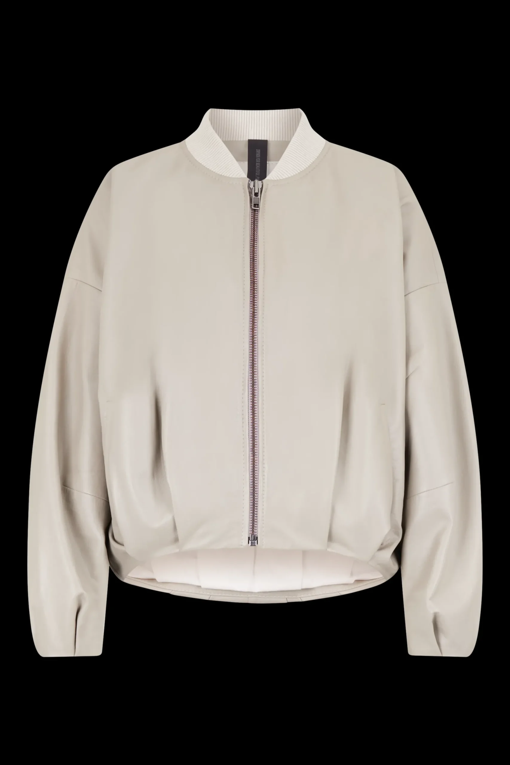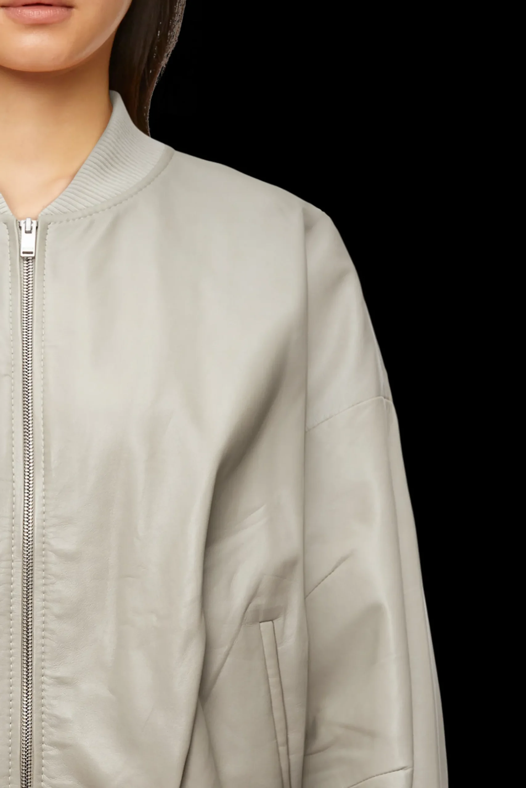 BRADDAN is een vrouwelijk bomberjack met opstaande kraag en oversized pasvorm. De plooien bij de zoom zijn een bijzonder detail. Het zachte nappaleer is chroomvrij gelooid.