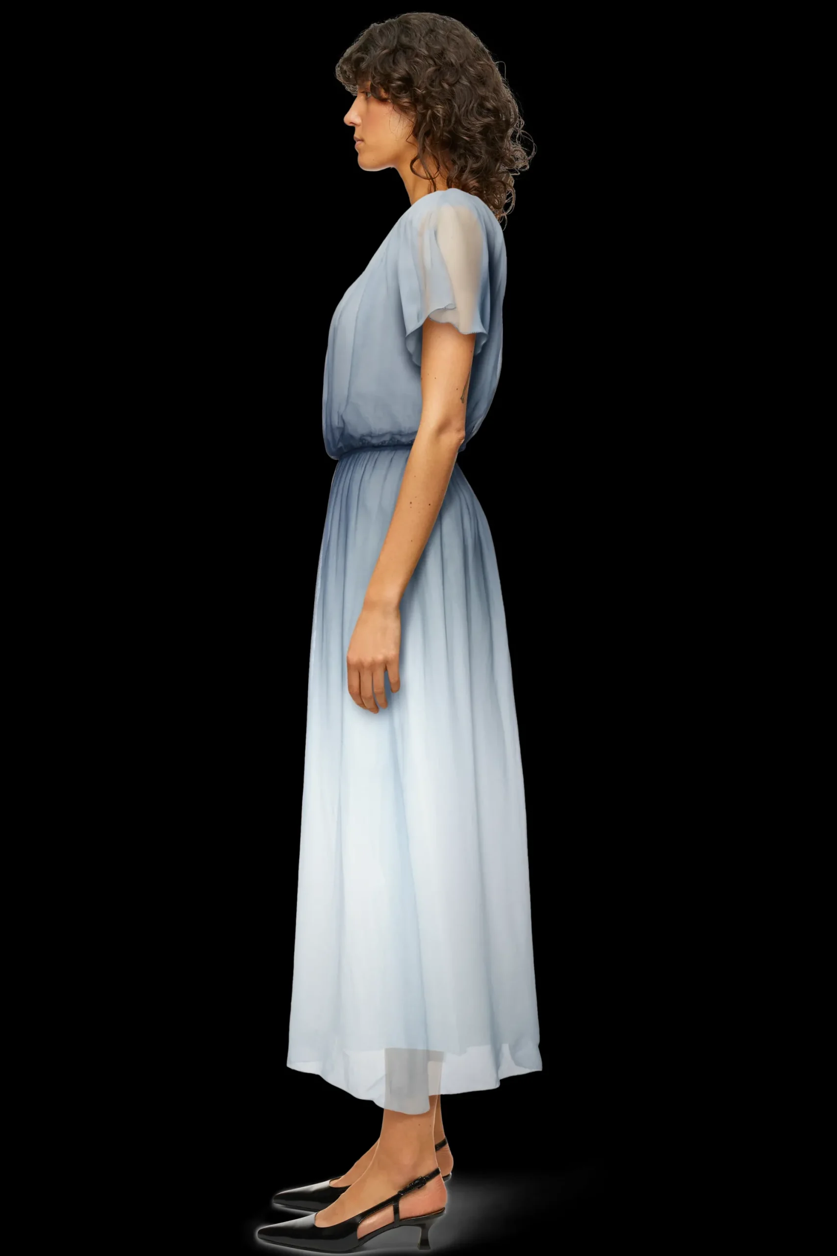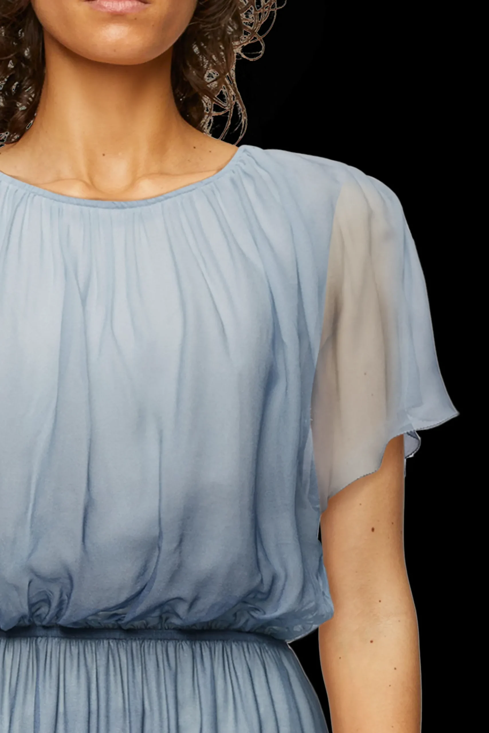 DUANA is een vrouwelijke maxi-jurk in een ontspannen pasvorm met een geaccentueerde taille, baby overlock aan de randen en een cut-out detail op de rug. Gemaakt van vloeiende viscosecrêpe met een dégradéprint, een materiaal dat comfortabel draagt en een visuele glans heeft.