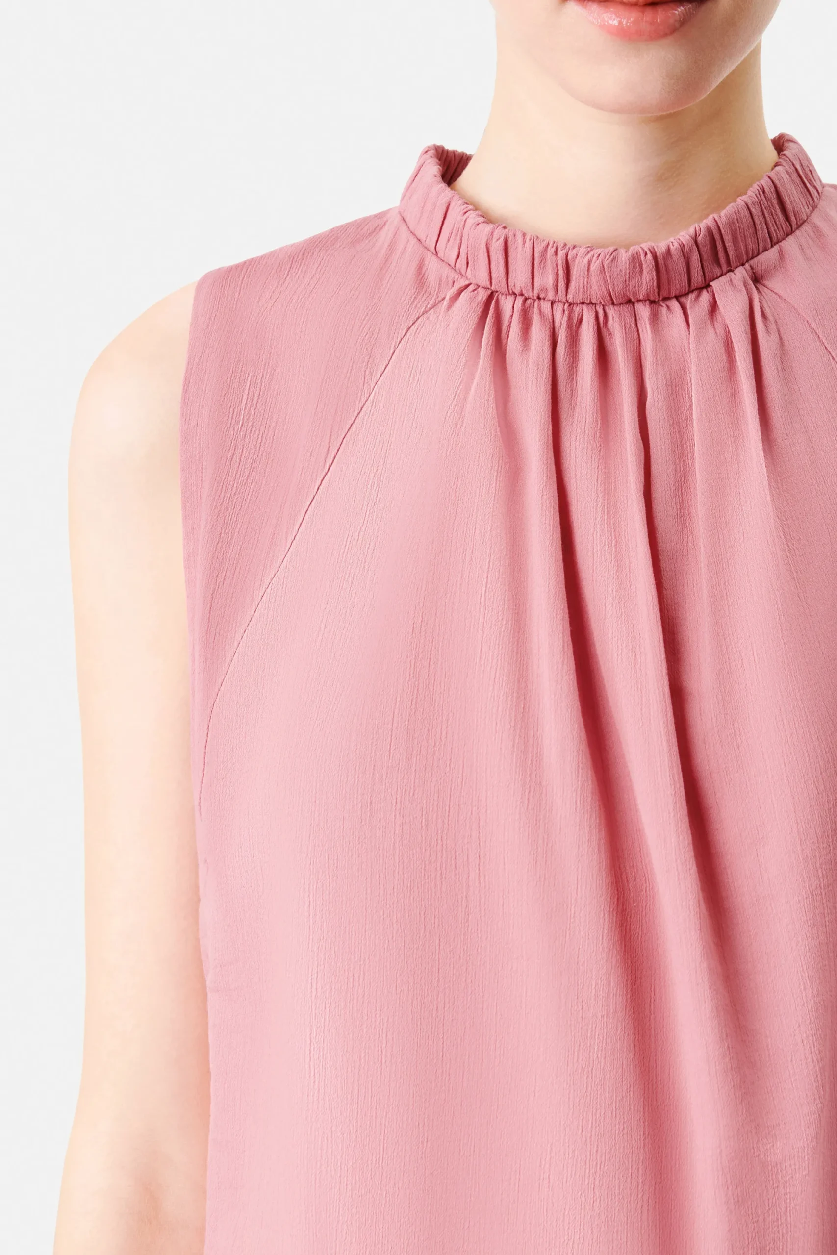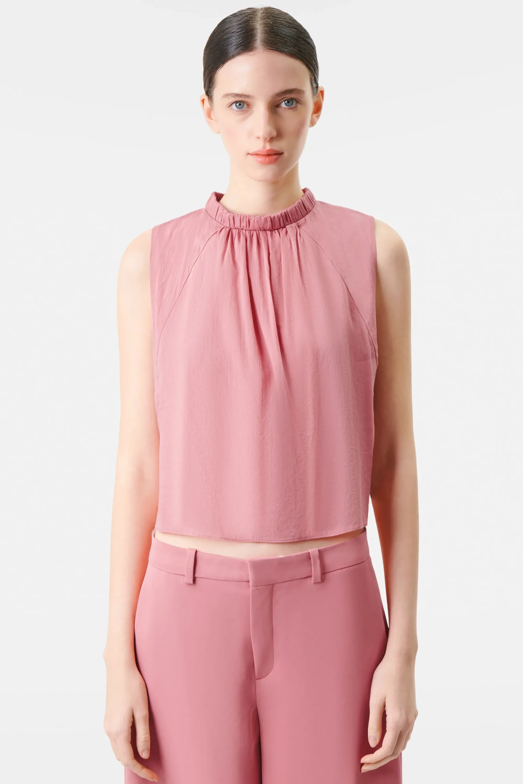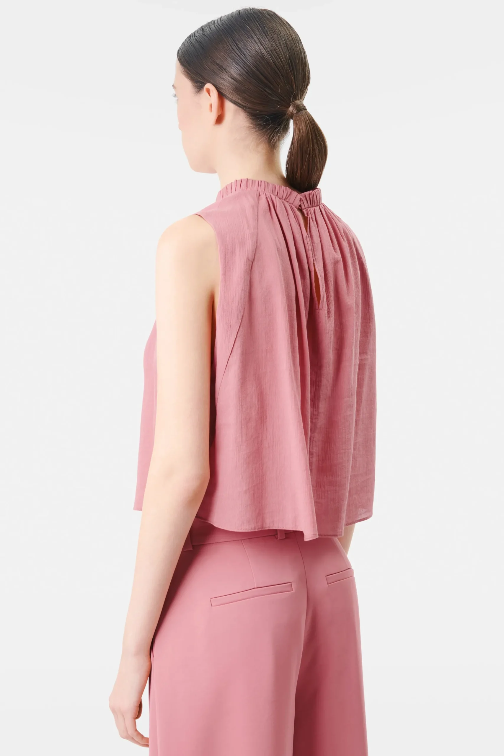 MONDYA is een vrouwelijke top met een smalle opstaande kraag. Het bijzondere detail is de rimpeling aan de voor- en achterkant. De achterkant heeft ook een open split. MONDYA is gemaakt van vloeiende katoen-viscose crêpe.