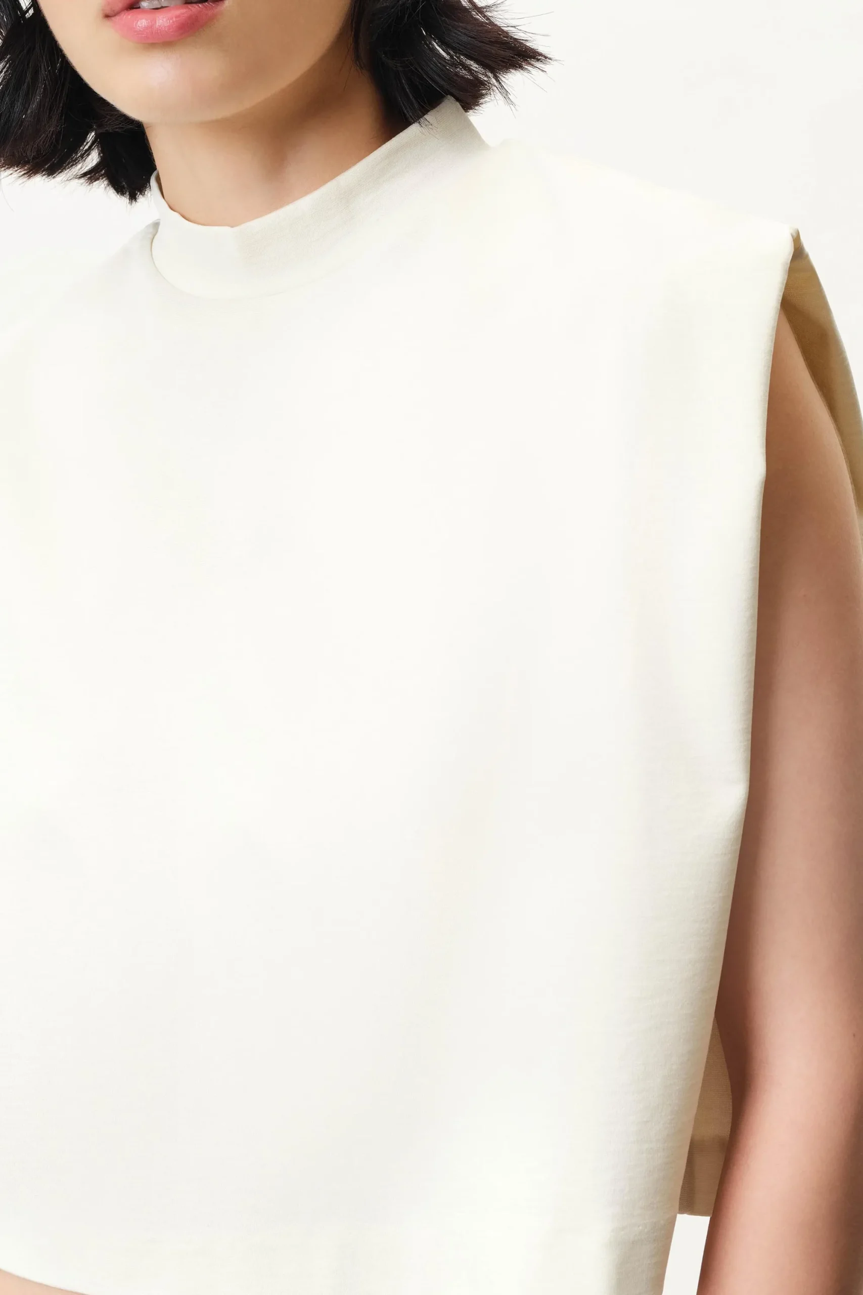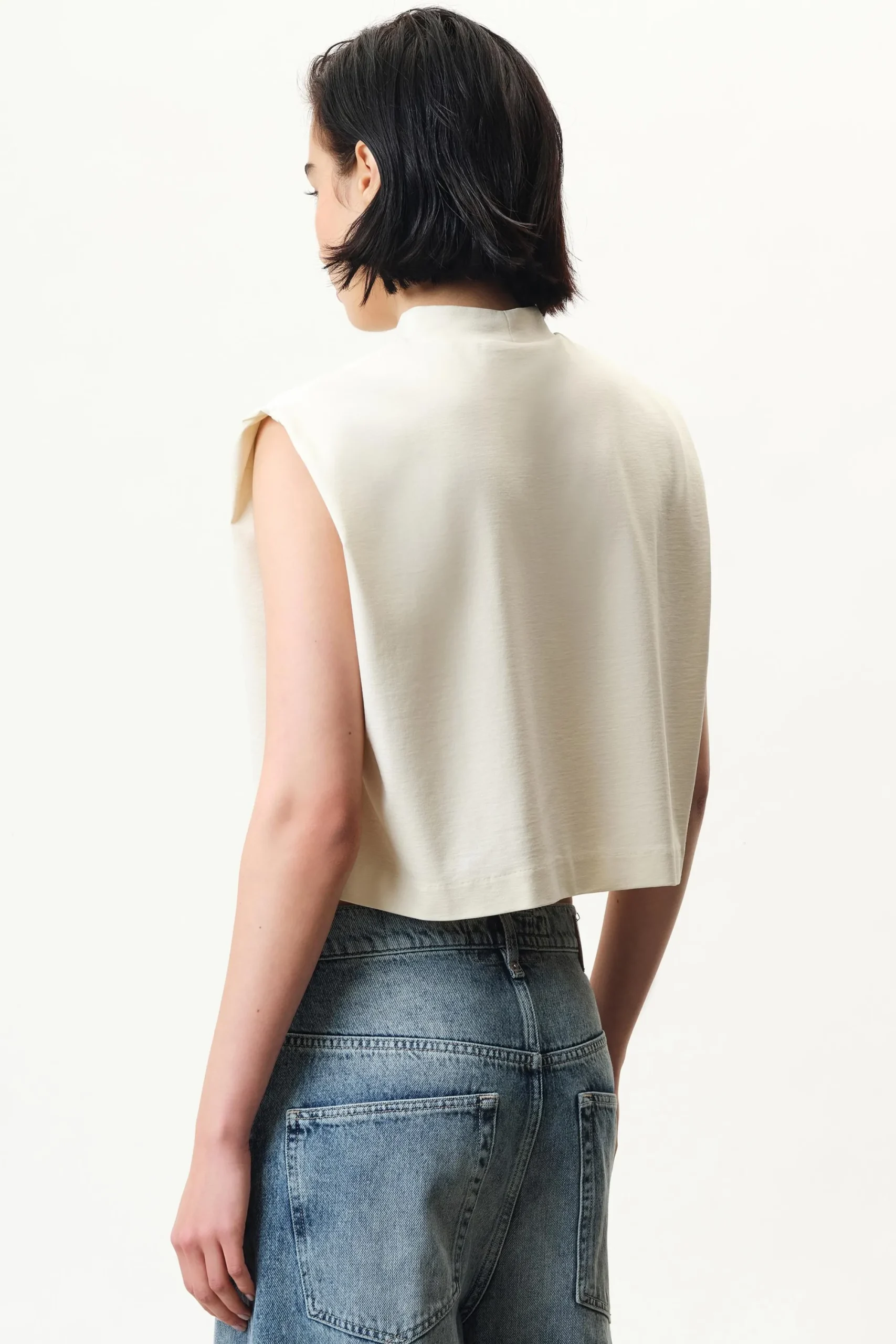 NAVINA is een boxy gesneden en iets verkorte top met opstaande kraag. NAVINA is gemaakt van zachte jersey.