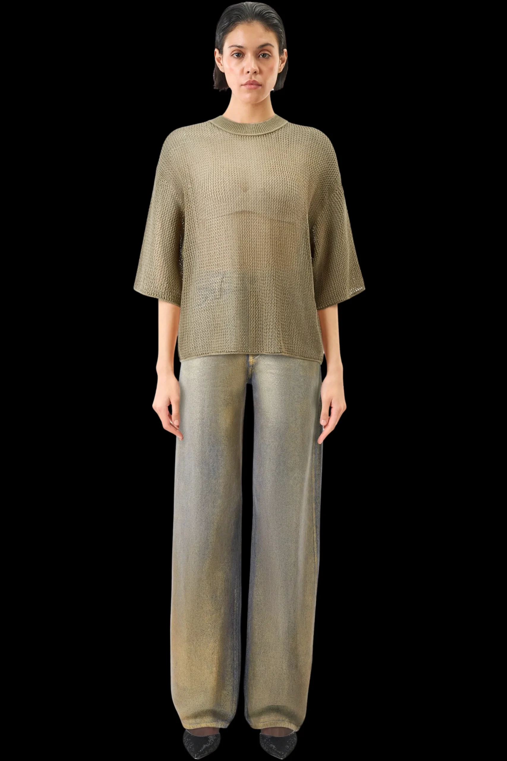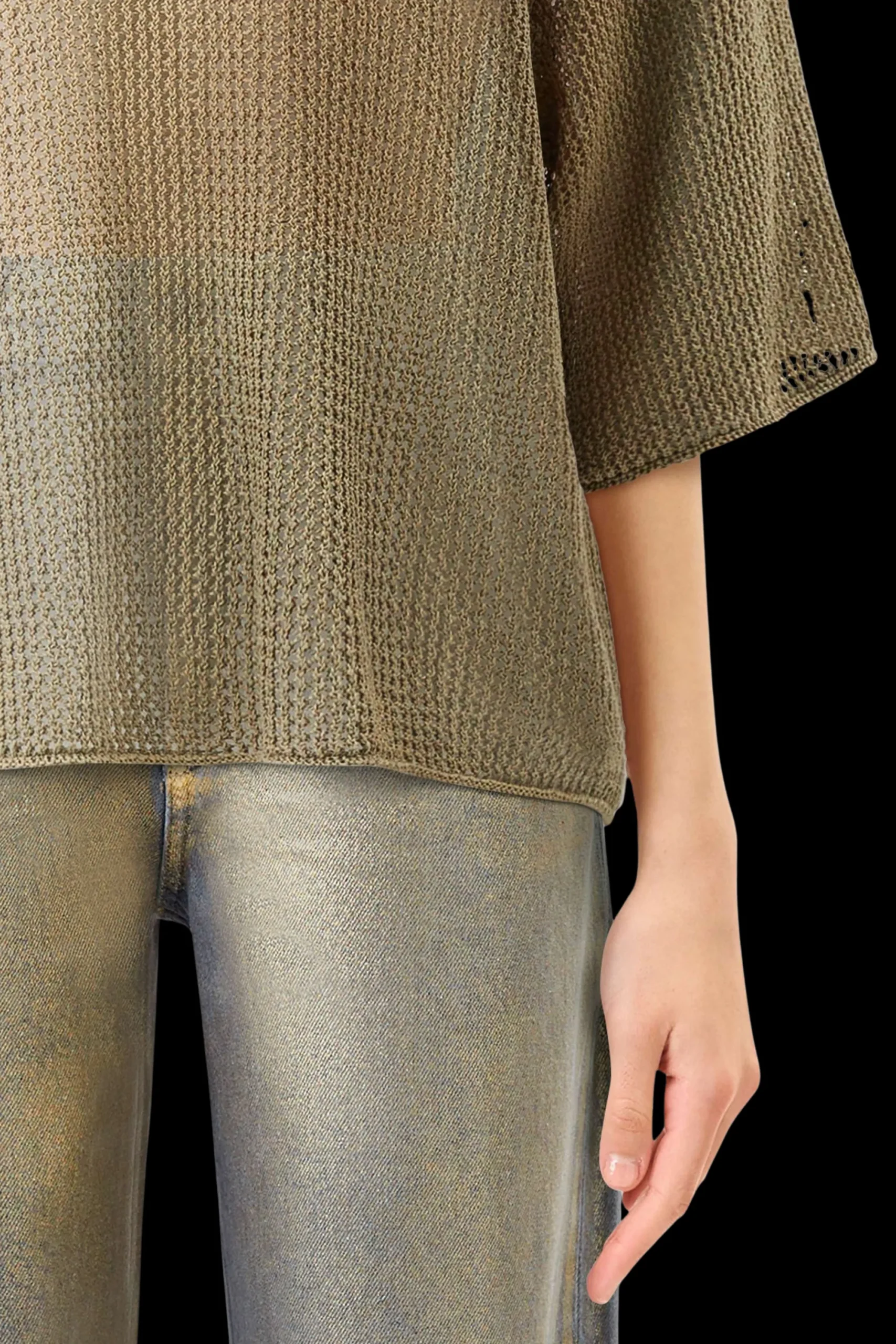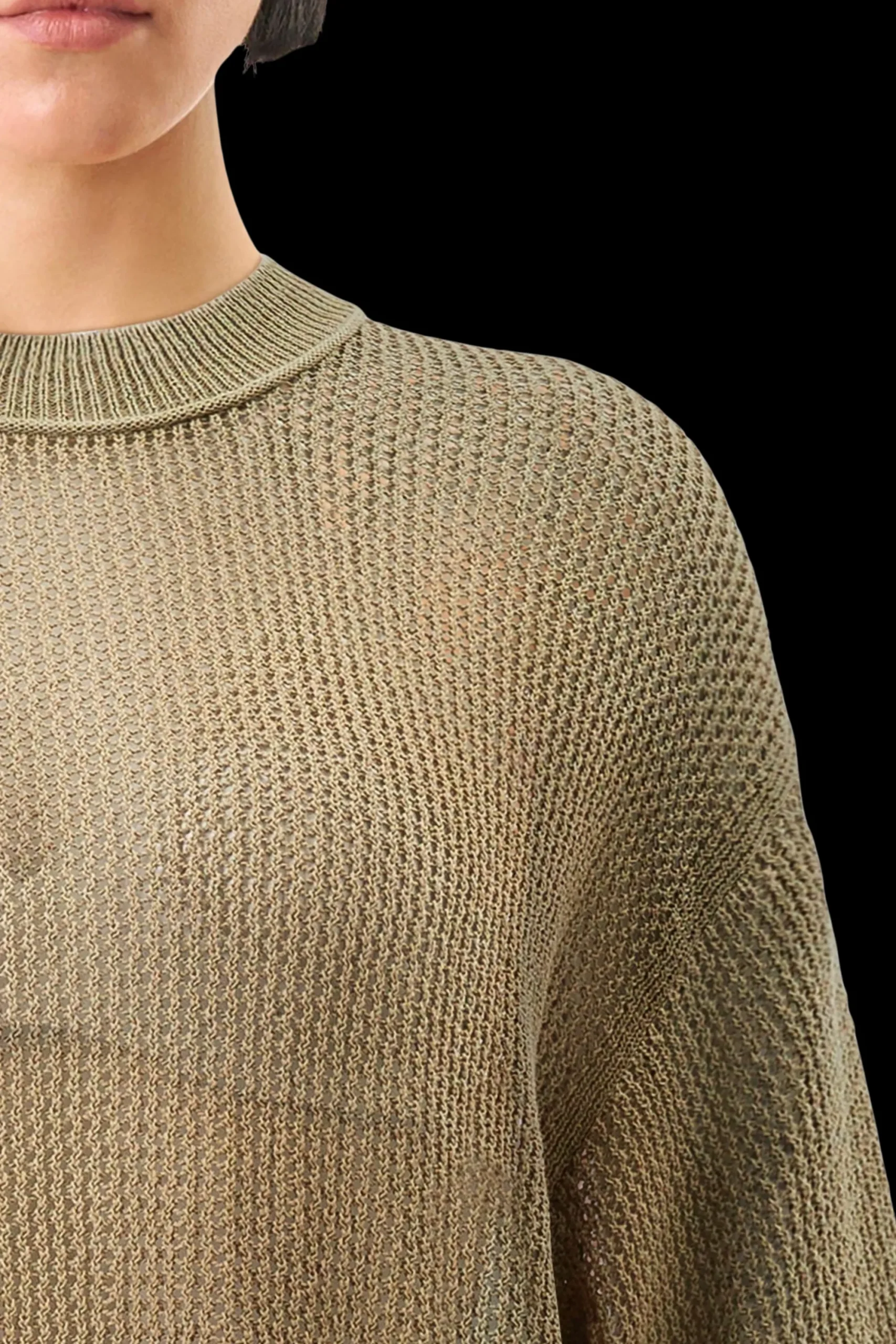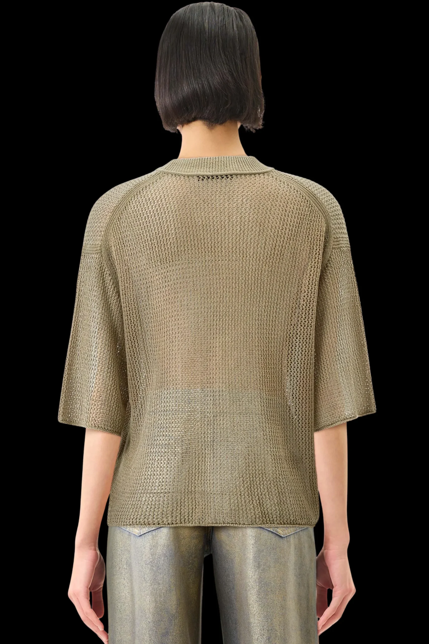 NILAY is een eenvoudig gebreid T-shirt met een oversized pasvorm, een ronde halslijn en 3/4 overgesneden mouwen, gemaakt van een hoogwaardig lintgaren met een moderne, open structuur.