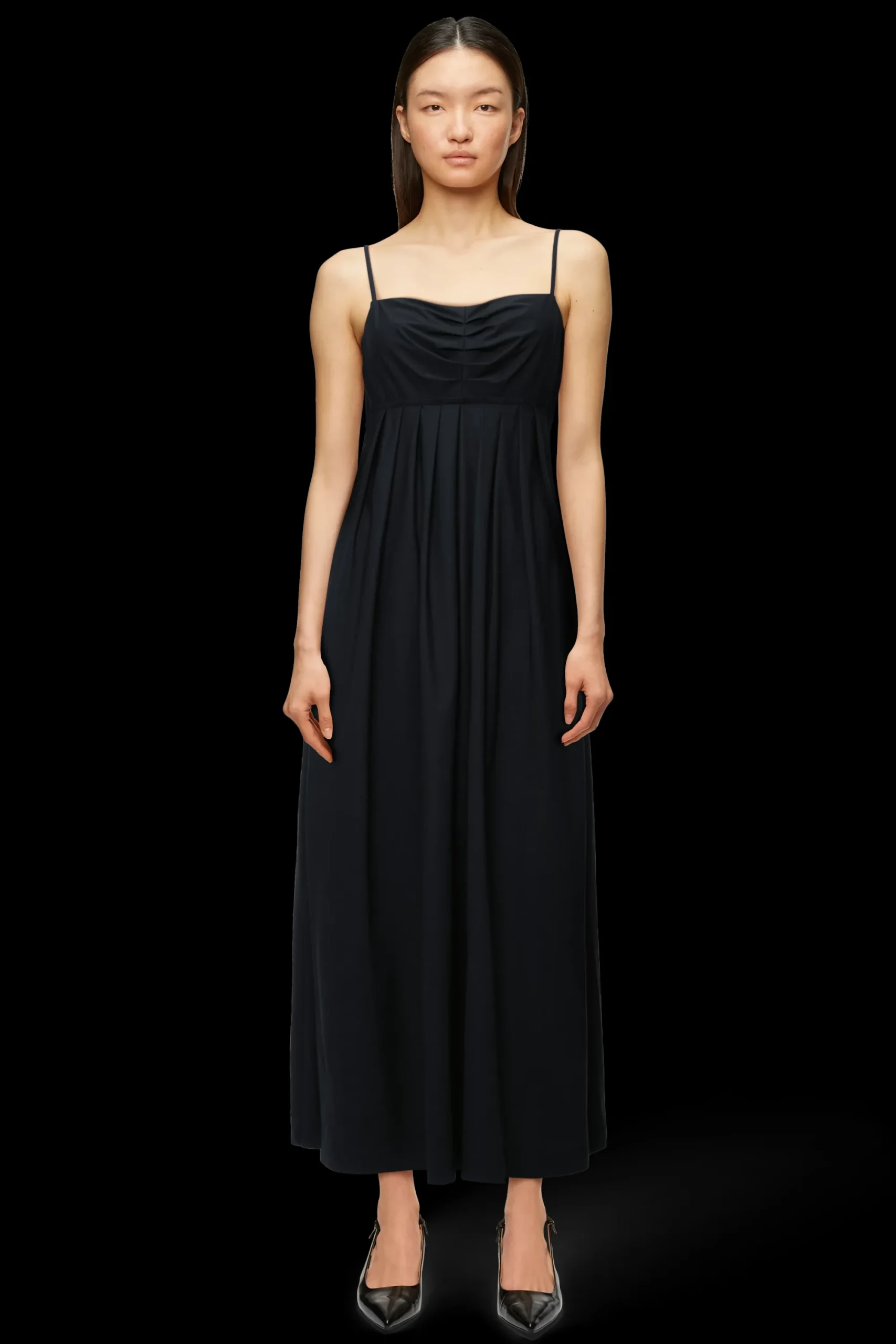 NOELIE is een vrouwelijke maxi empire jurk in een klassieke pasvorm. De boxplooien op het lijfje en de plooien op de rok zijn een bijzonder detail. Gemaakt van fijne technische jersey.