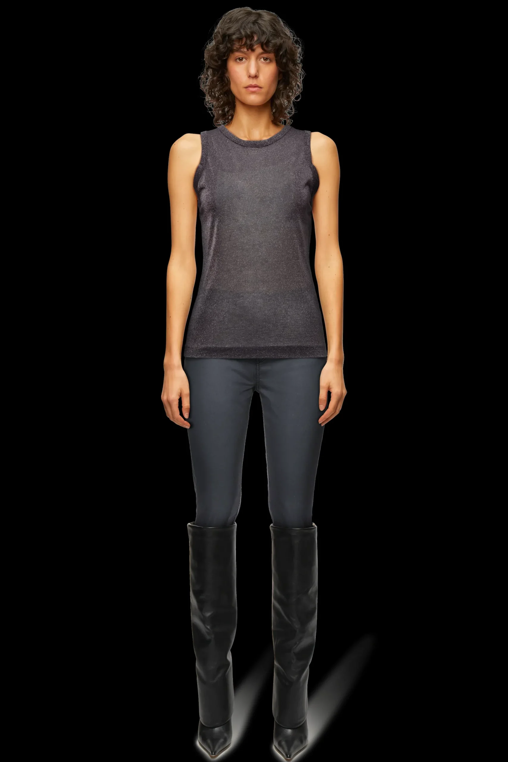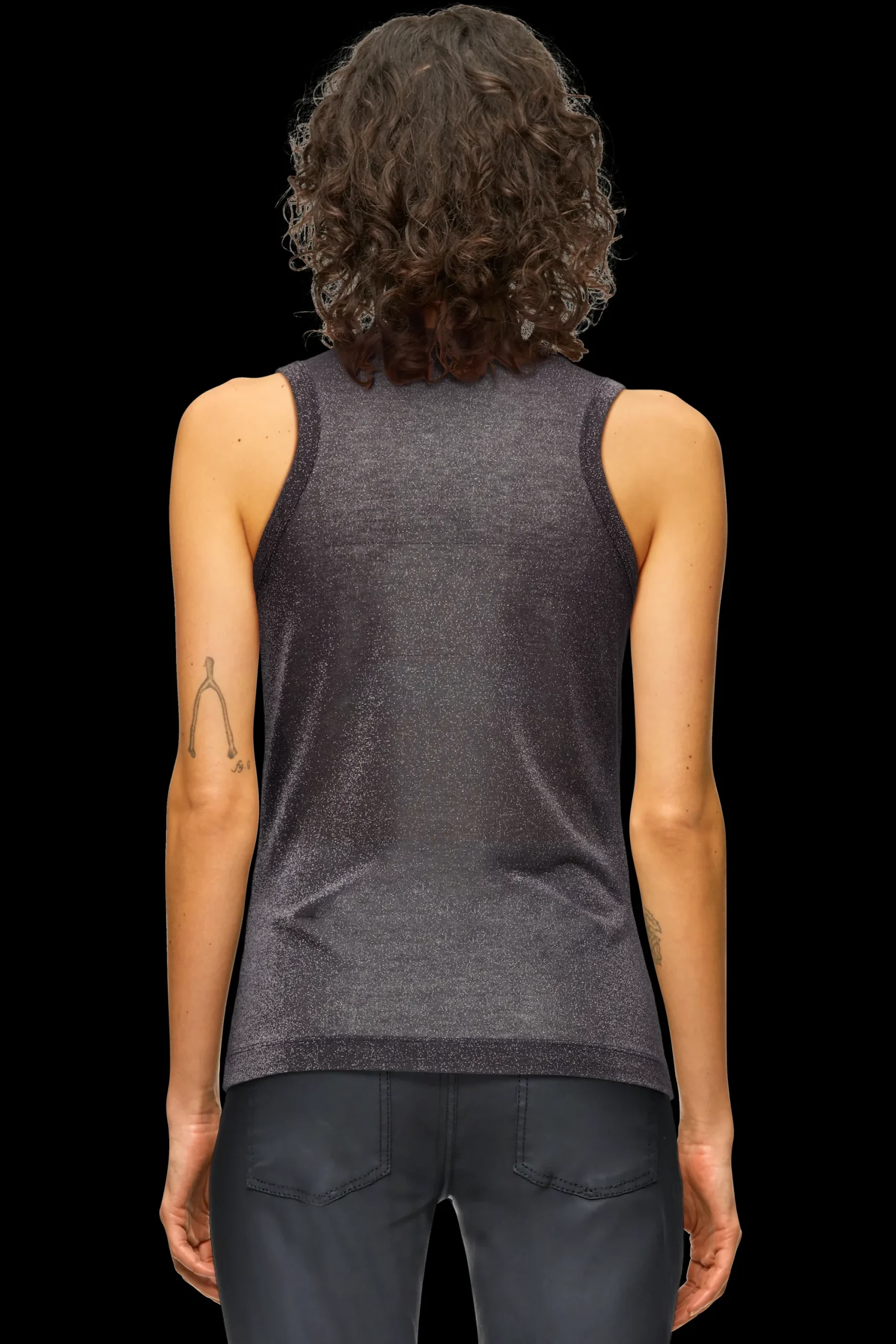 OLINA is een klassieke sportieve tanktop met een fijne geribbelde structuur. De aansluitende pasvorm en het tijdloze ontwerp maken het een perfecte dagelijkse essential. De licht transparante lurex-jersey zorgt voor een moderne en luxueuze uitstraling.