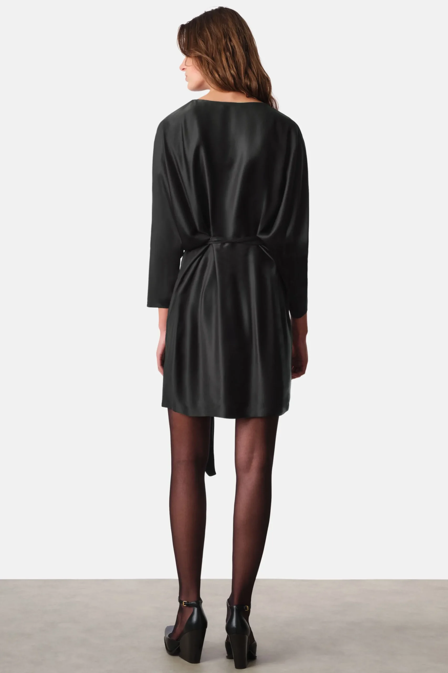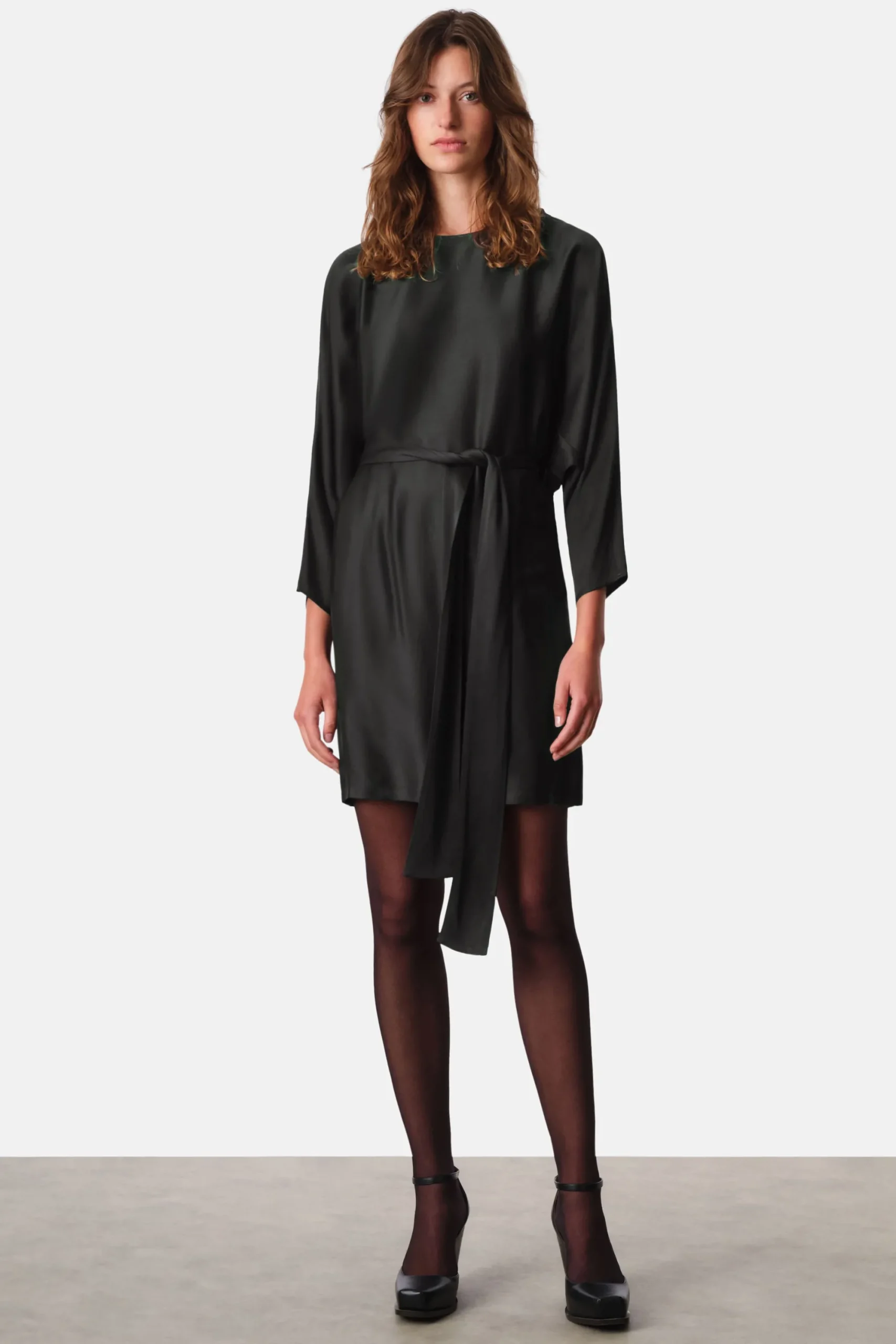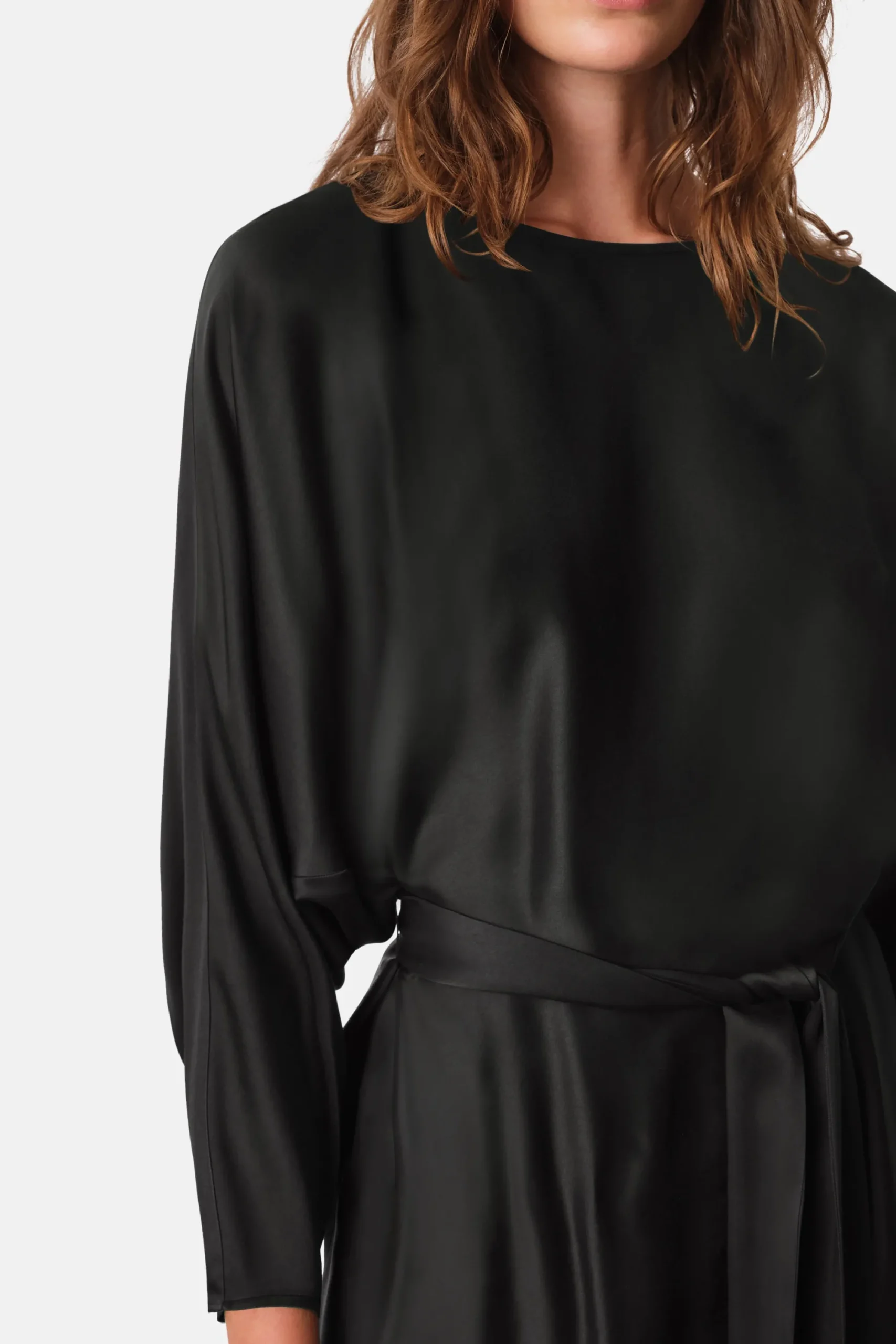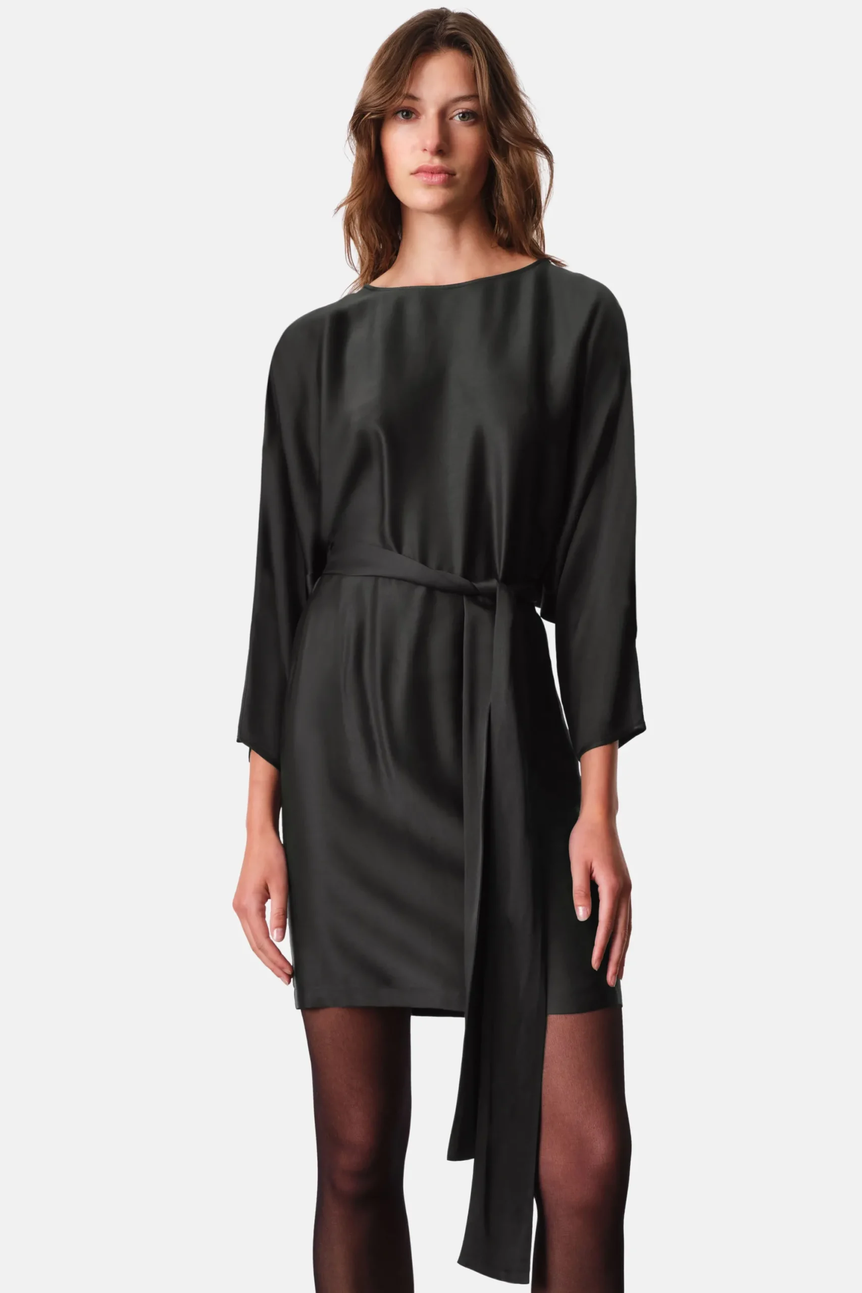 RURIKA is een modieuze mini jurk met vleermuismouwen en een strikceintuur. Deze jurk combineert op elegante wijze comfort en stijl. De vleermuismouwen zorgen voor een losse pasvorm en de strikceintuur creëert een vrouwelijk silhouet. Gemaakt van delicaat satijn.