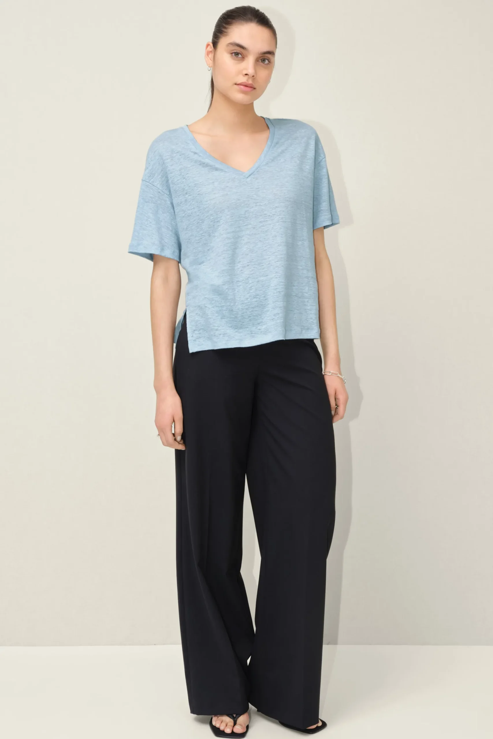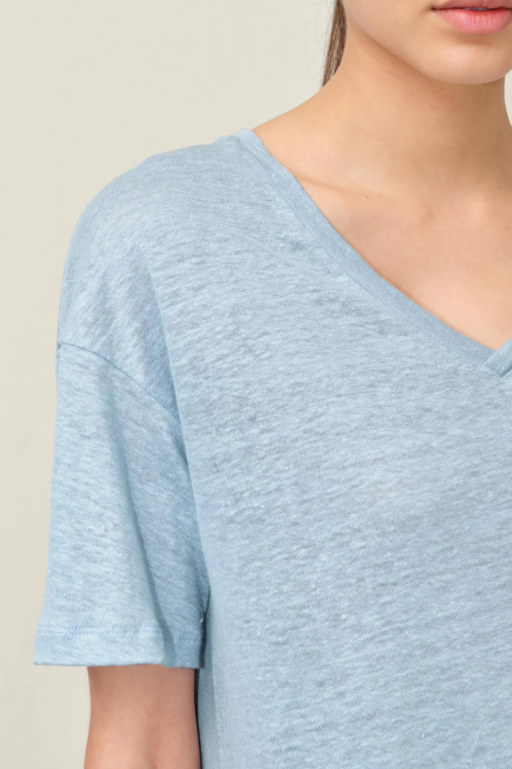 SVENNIE is een klassiek T-shirt met V-hals en halve mouwen in een relaxte pasvorm met dropped shoulders. Het zomerse linnen stuk is de perfecte metgezel voor warme dagen.