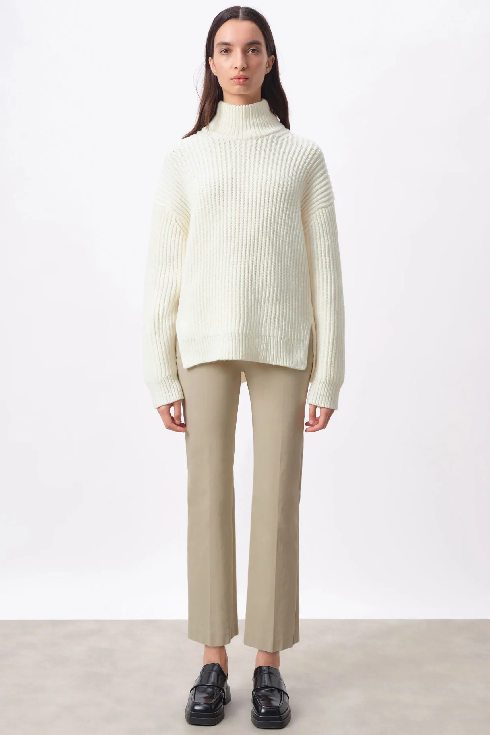 VIORIKA is een modieuze coltrui met zijsplitten. Deze trui combineert comfort en stijl op een elegante manier. Hij is veelzijdig en een must-have voor je herfst- en wintergarderobe. VIORIKA is gemaakt van grove scheerwol.