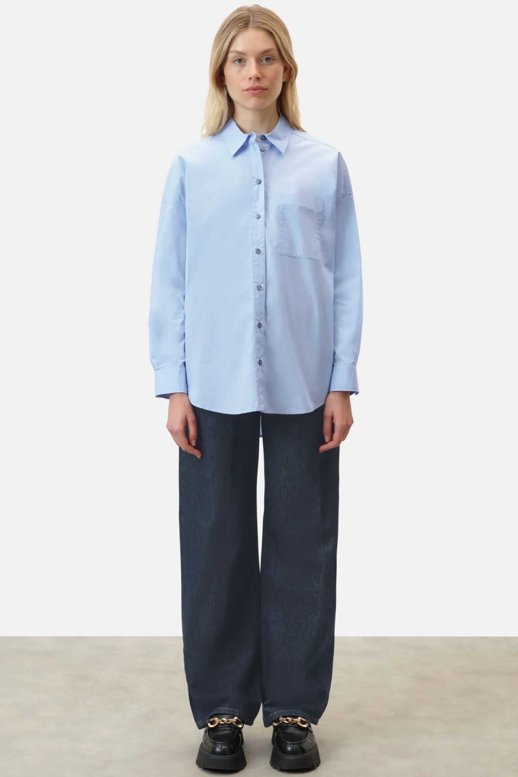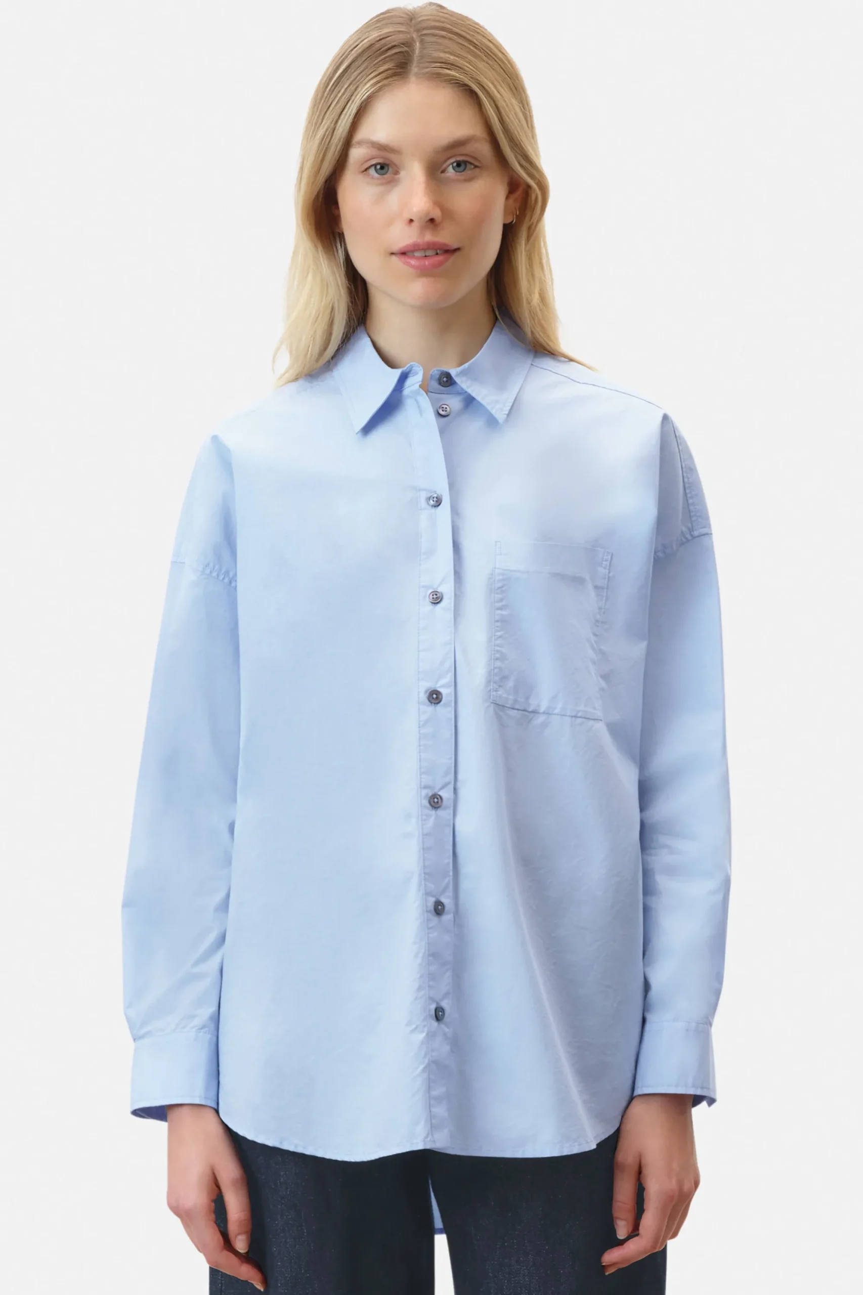De klassieke AAKE blouse heeft een overhemdkraag, opgestikte borstzak en zijn oversized pasvorm.AAKE is gemaakt van klassieke losvallende popeline.