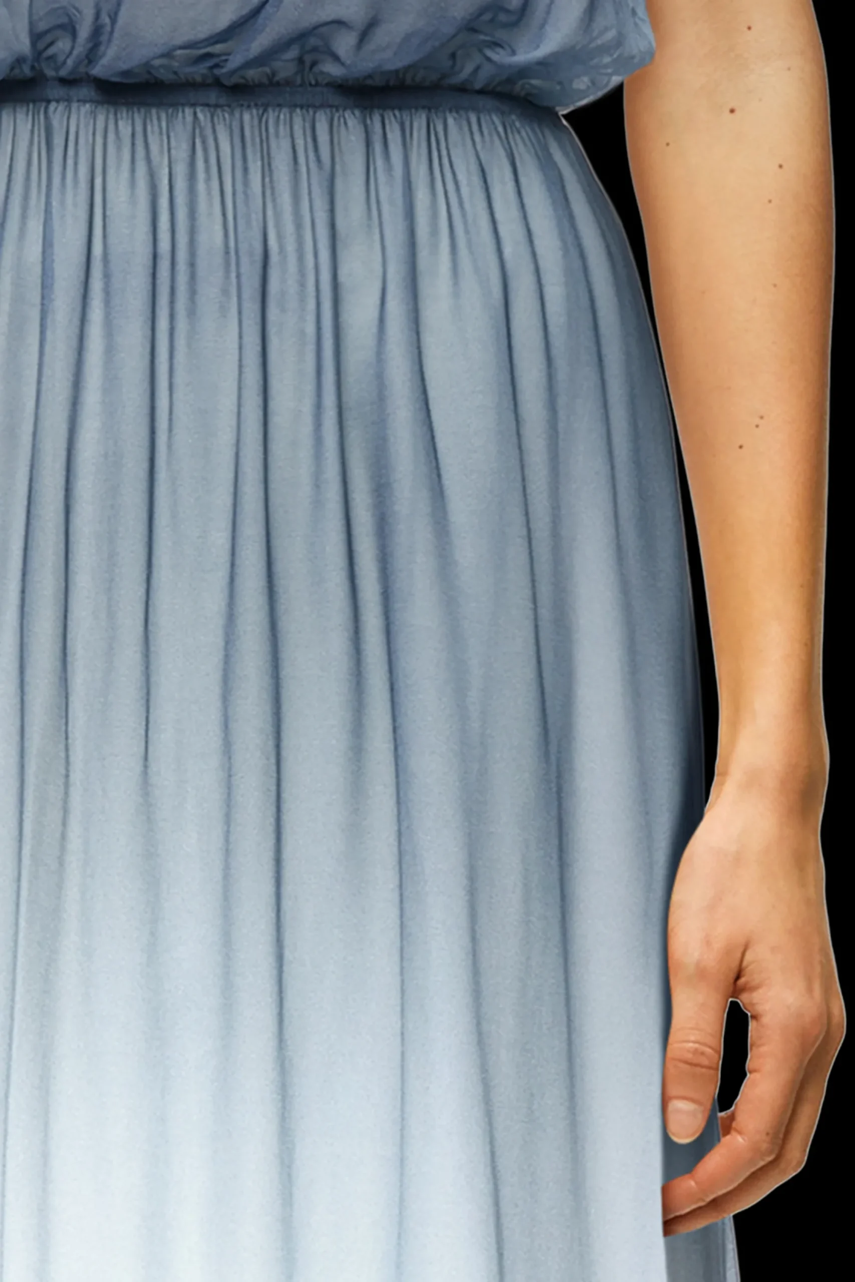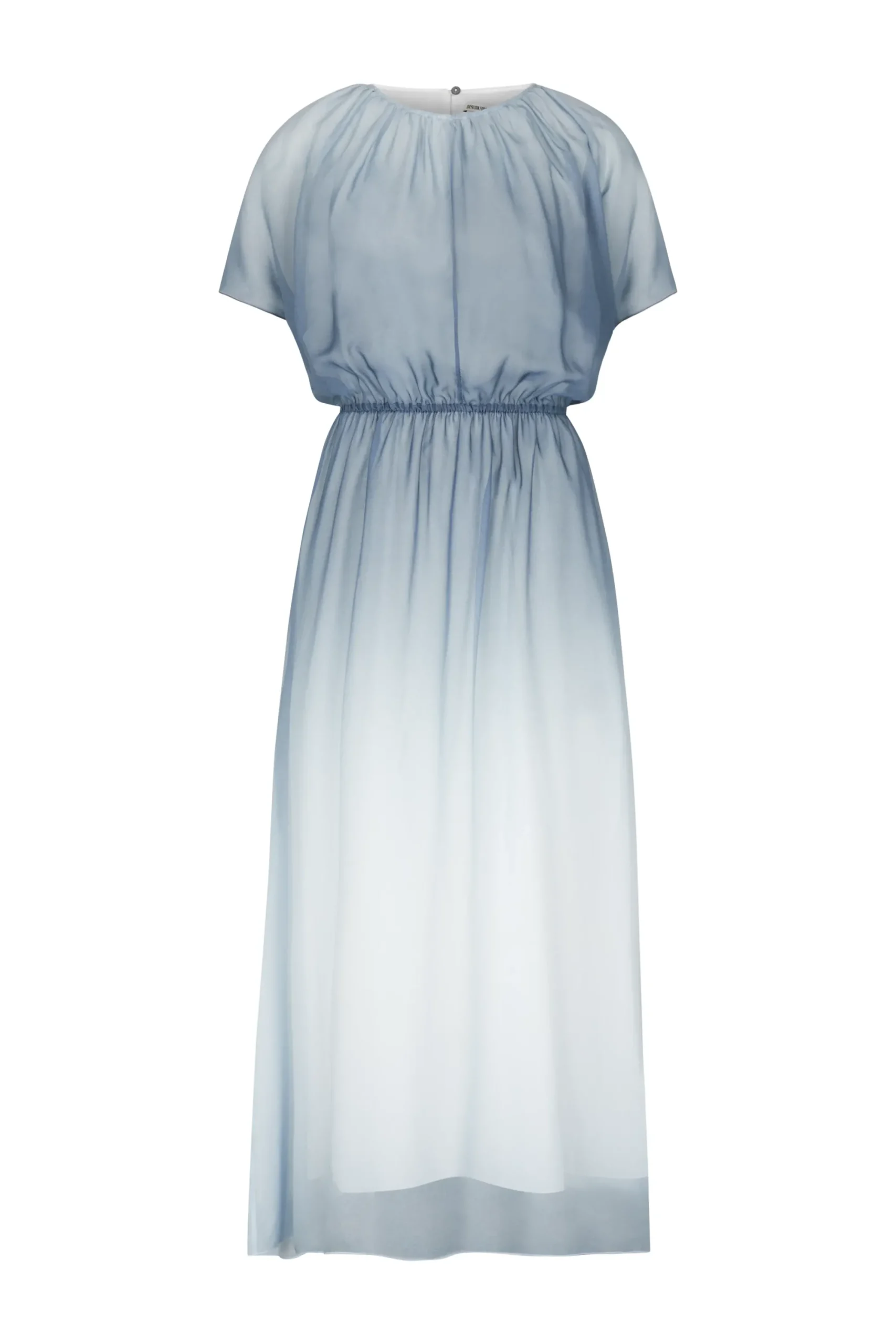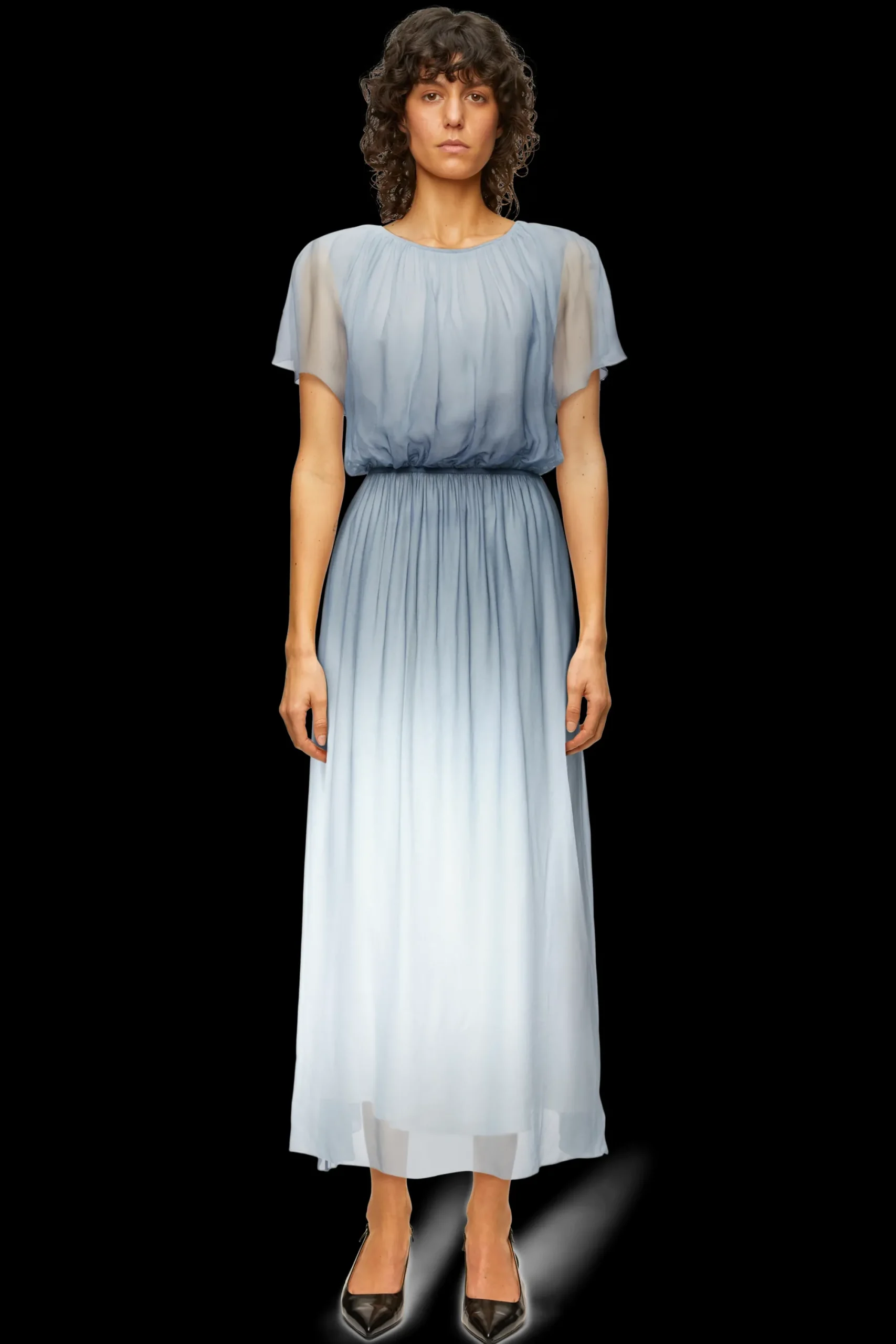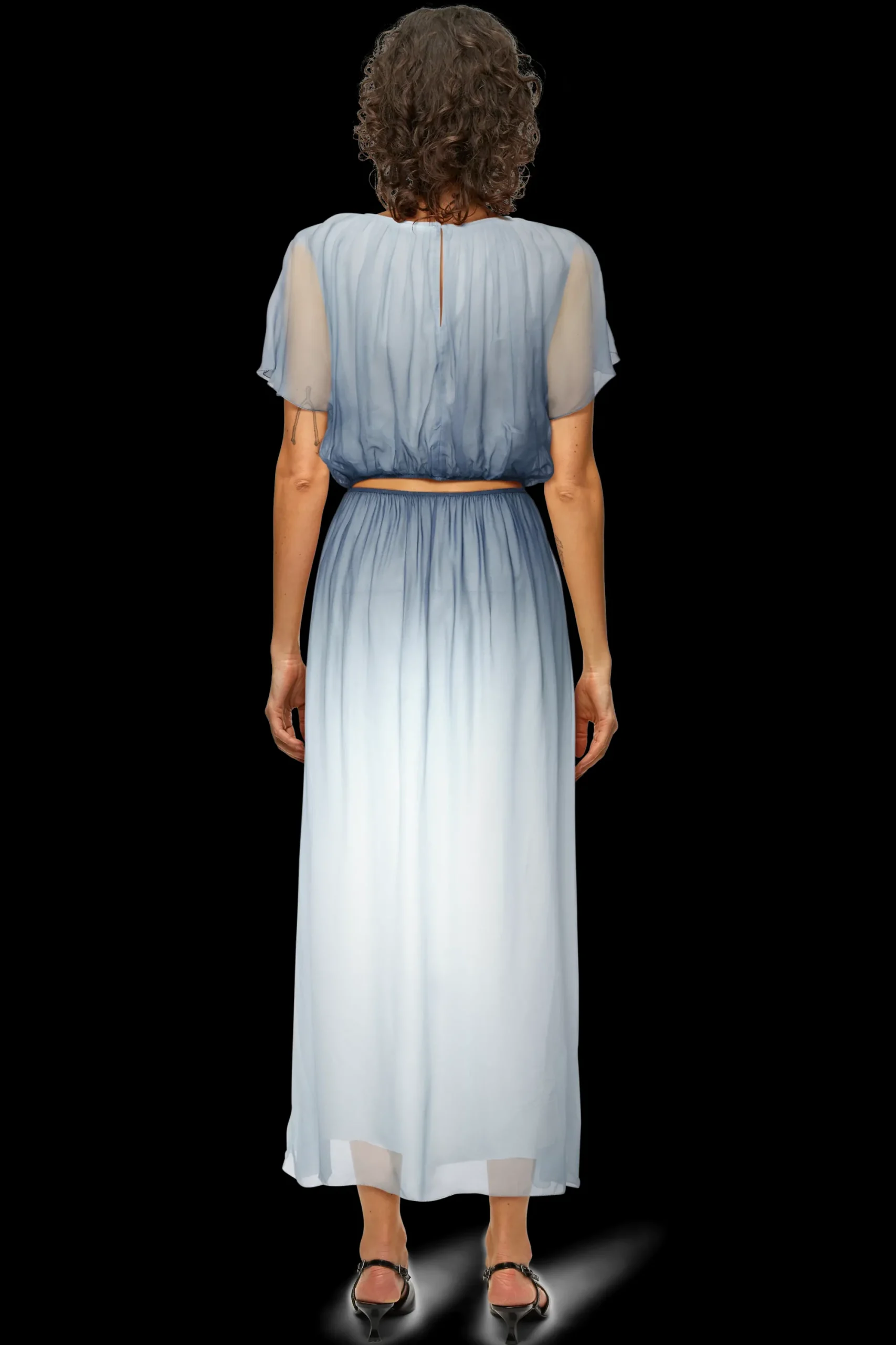 DUANA is een vrouwelijke maxi-jurk in een ontspannen pasvorm met een geaccentueerde taille, baby overlock aan de randen en een cut-out detail op de rug. Gemaakt van vloeiende viscosecrêpe met een dégradéprint, een materiaal dat comfortabel draagt en een visuele glans heeft.