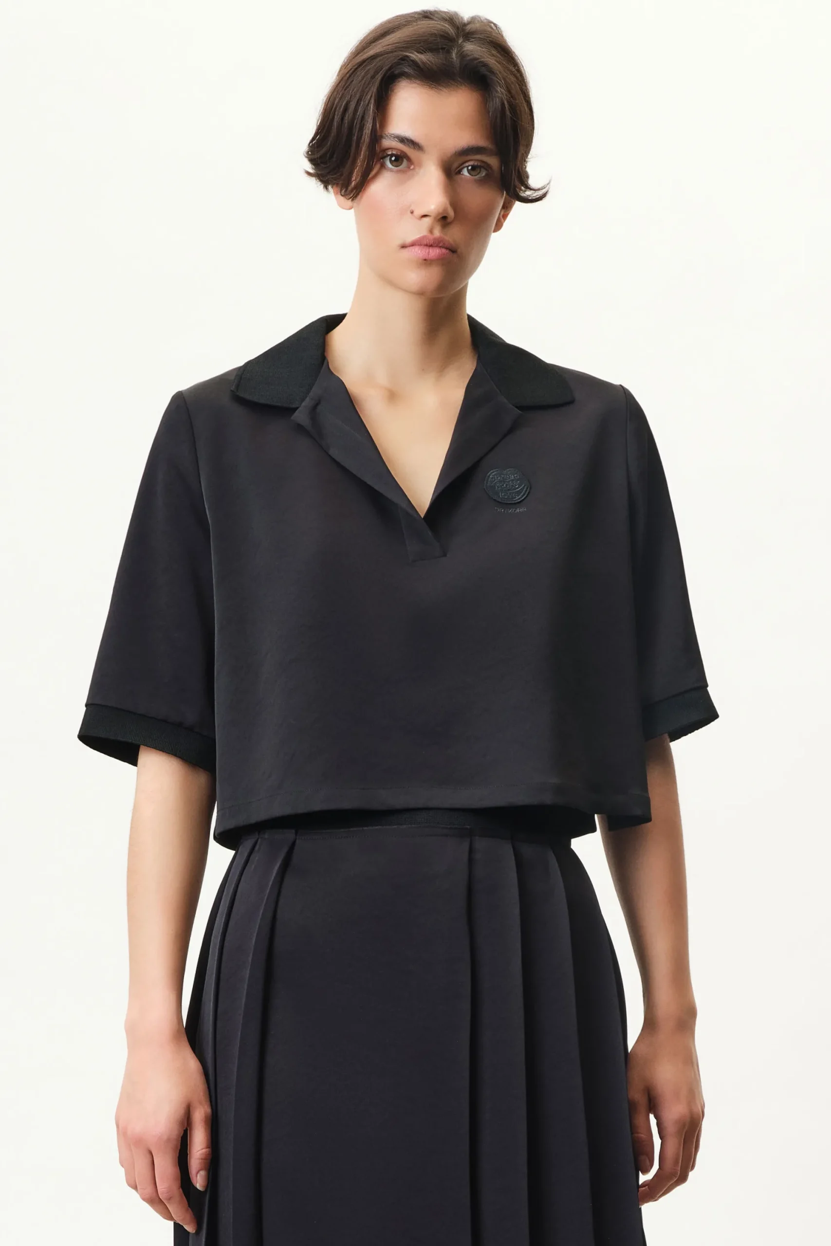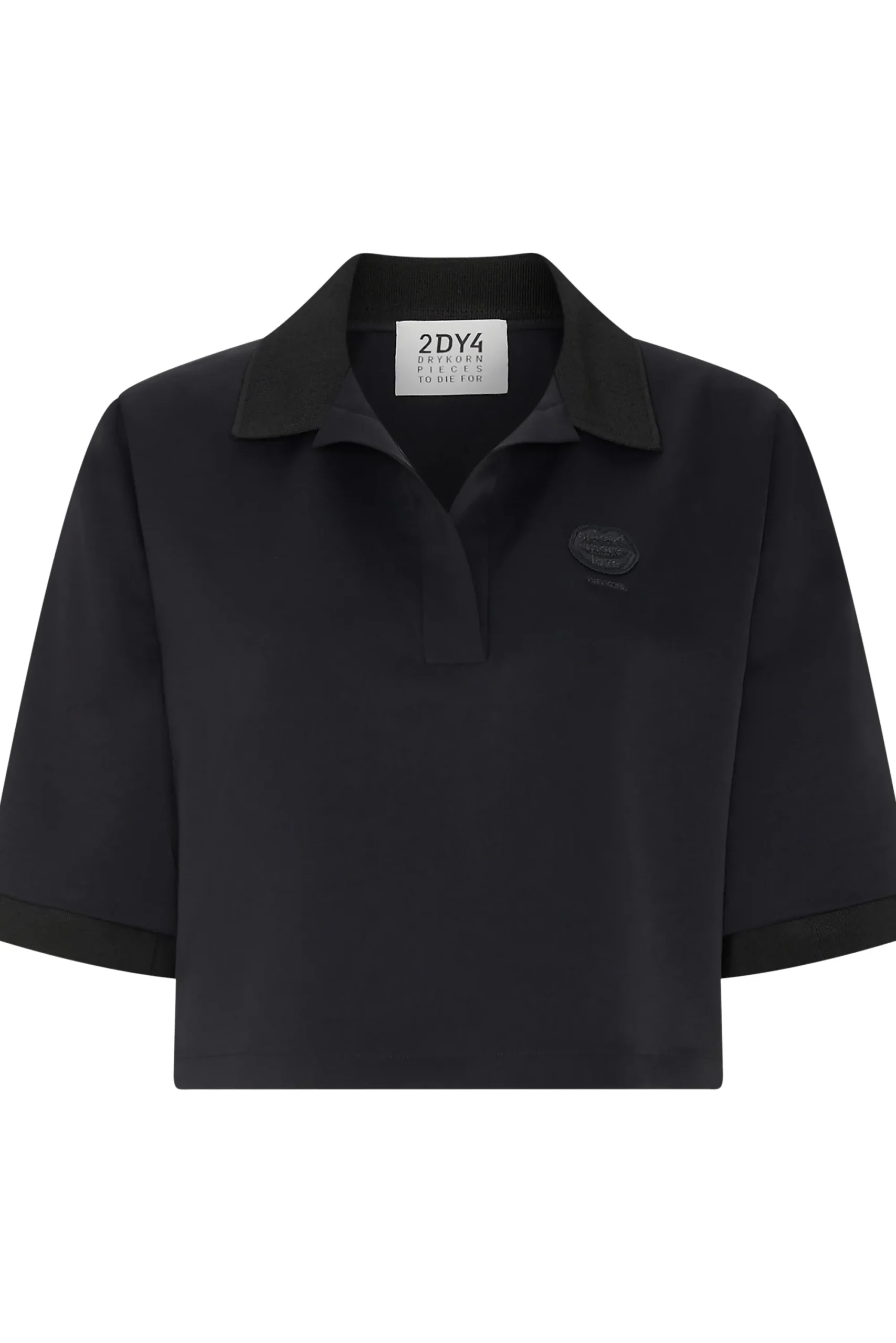 De DYLANA polo met korte mouwen valt op door zijn cropped fit en “SPREAD MORE LOVE borduursel.Het glinsterende satijn zorgt voor een casual stijl.”