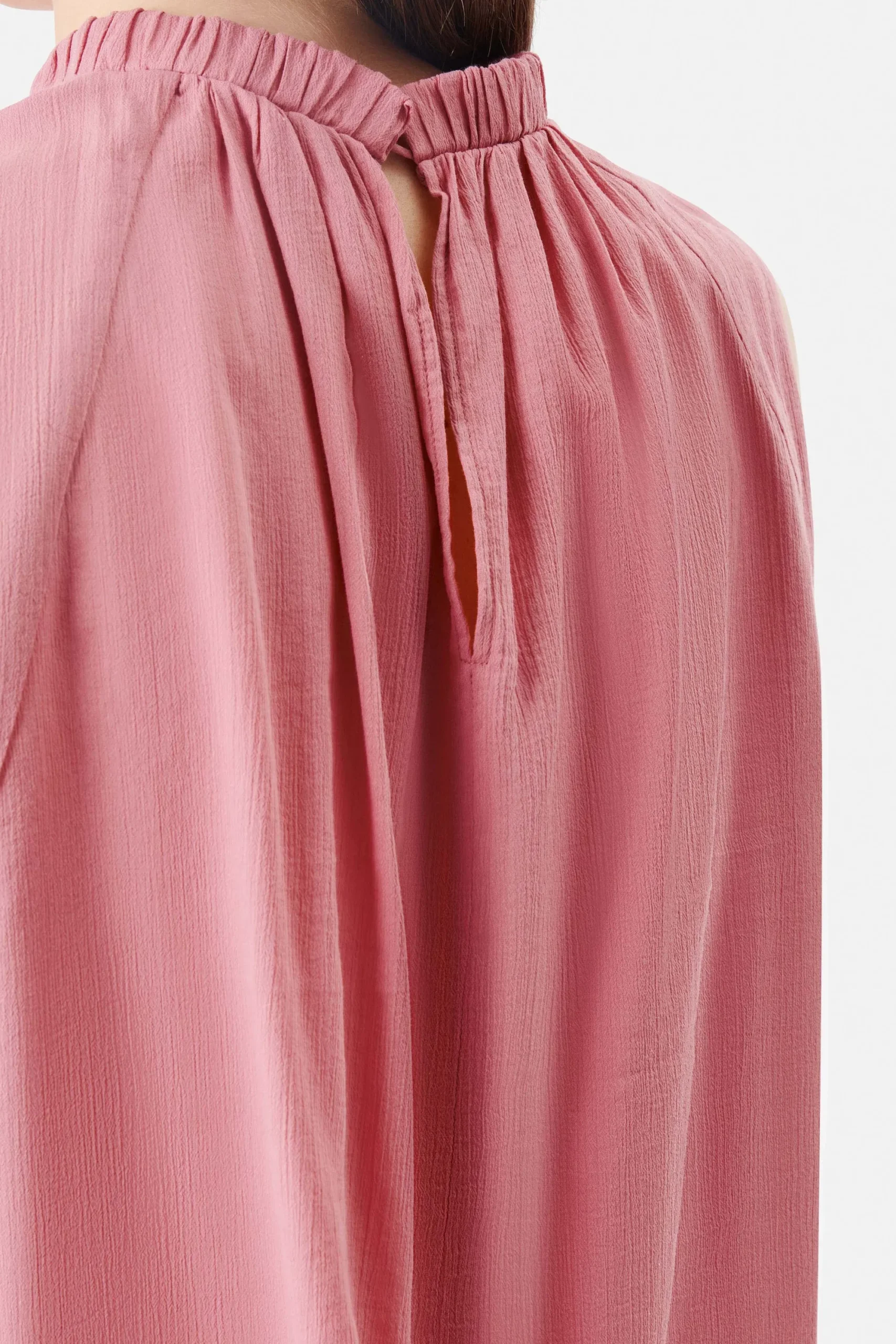 MONDYA is een vrouwelijke top met een smalle opstaande kraag. Het bijzondere detail is de rimpeling aan de voor- en achterkant. De achterkant heeft ook een open split. MONDYA is gemaakt van vloeiende katoen-viscose crêpe.