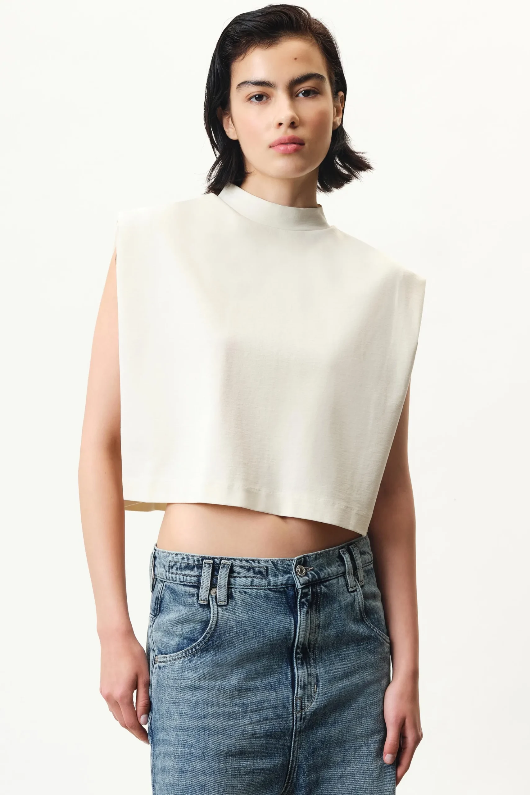 NAVINA is een boxy gesneden en iets verkorte top met opstaande kraag. NAVINA is gemaakt van zachte jersey.