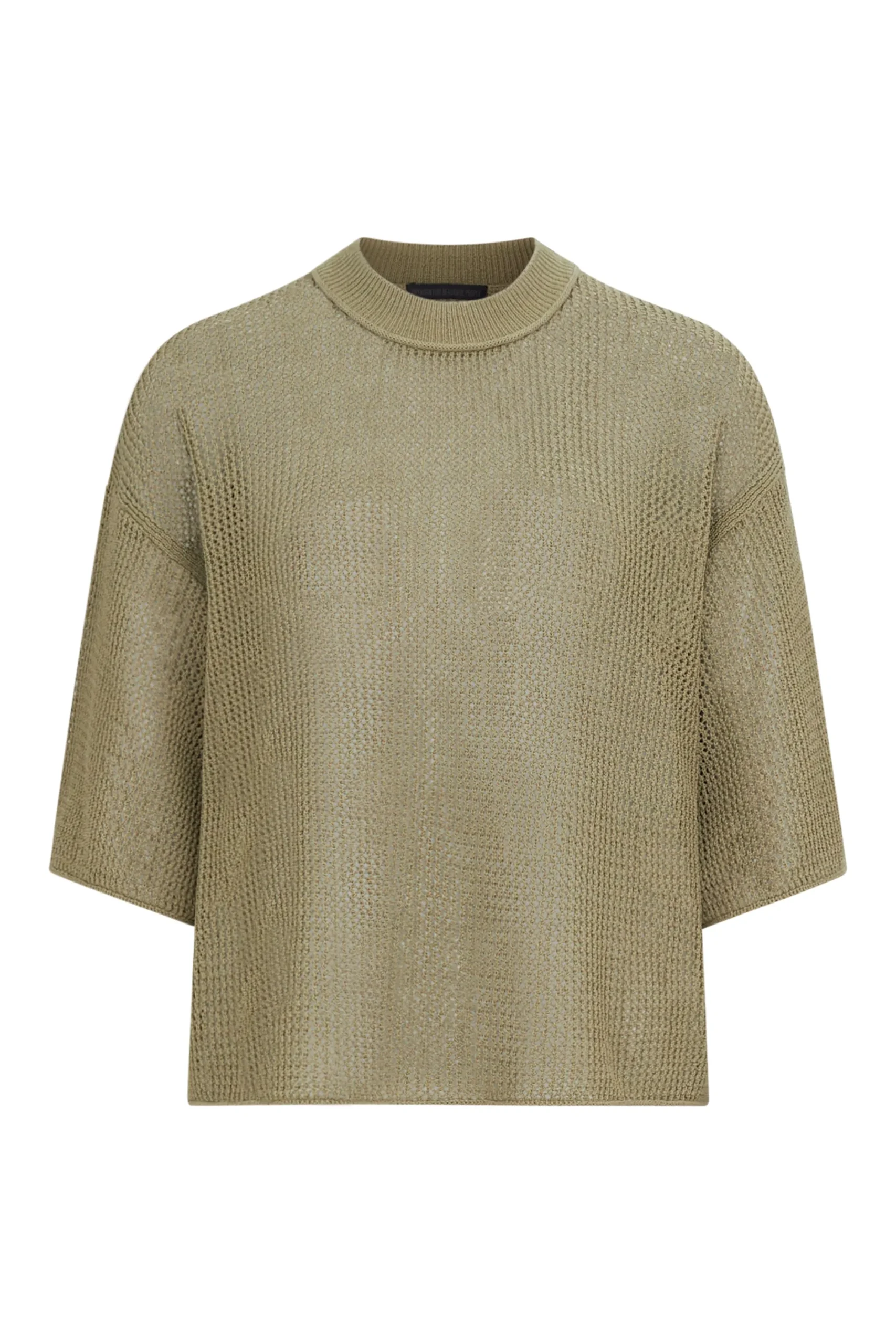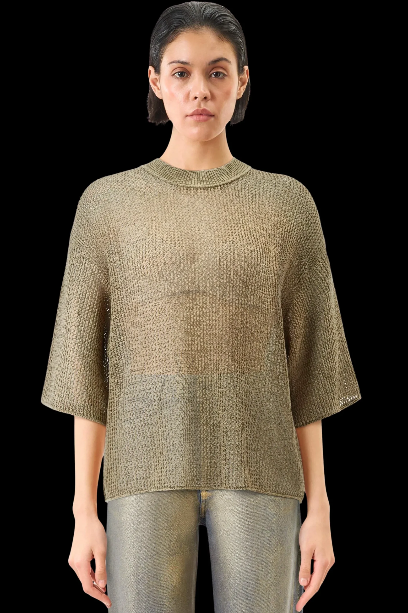 NILAY is een eenvoudig gebreid T-shirt met een oversized pasvorm, een ronde halslijn en 3/4 overgesneden mouwen, gemaakt van een hoogwaardig lintgaren met een moderne, open structuur.