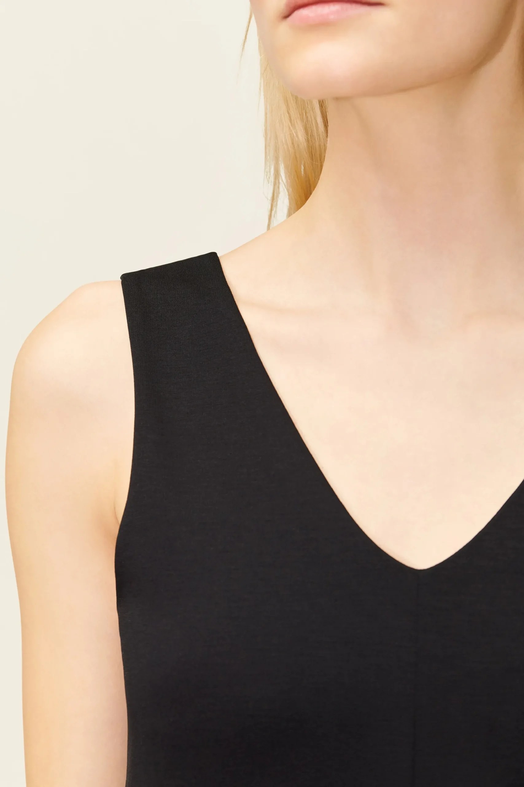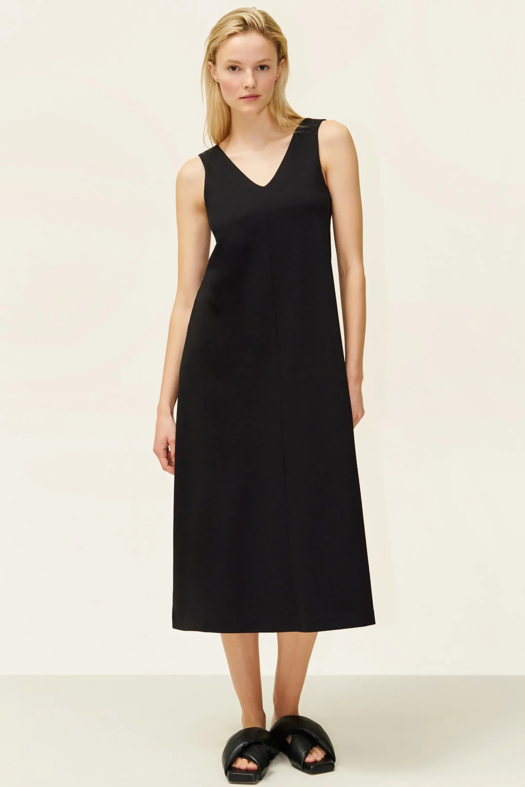 RESIMA is een mouwloze, cleane jurk met V-hals. De rok is licht A-vormig en biedt veel bewegingsvrijheid. De hoogwaardige, zachte lyocell mix biedt een cleane look en is comfortabel om te dragen.