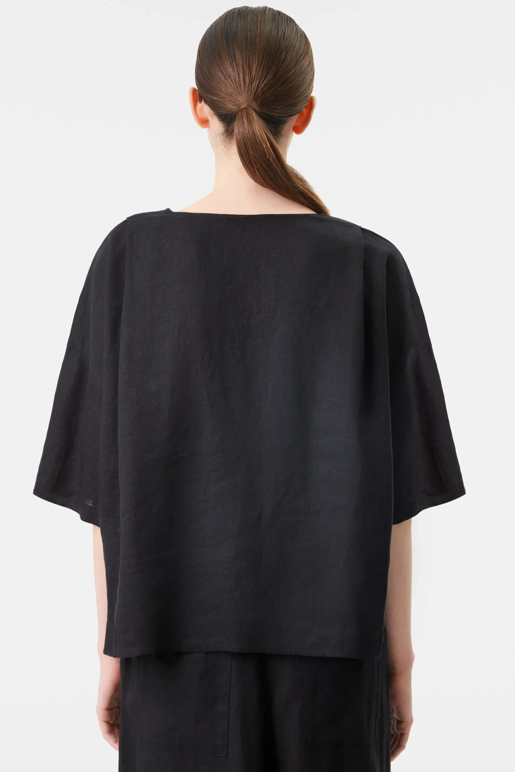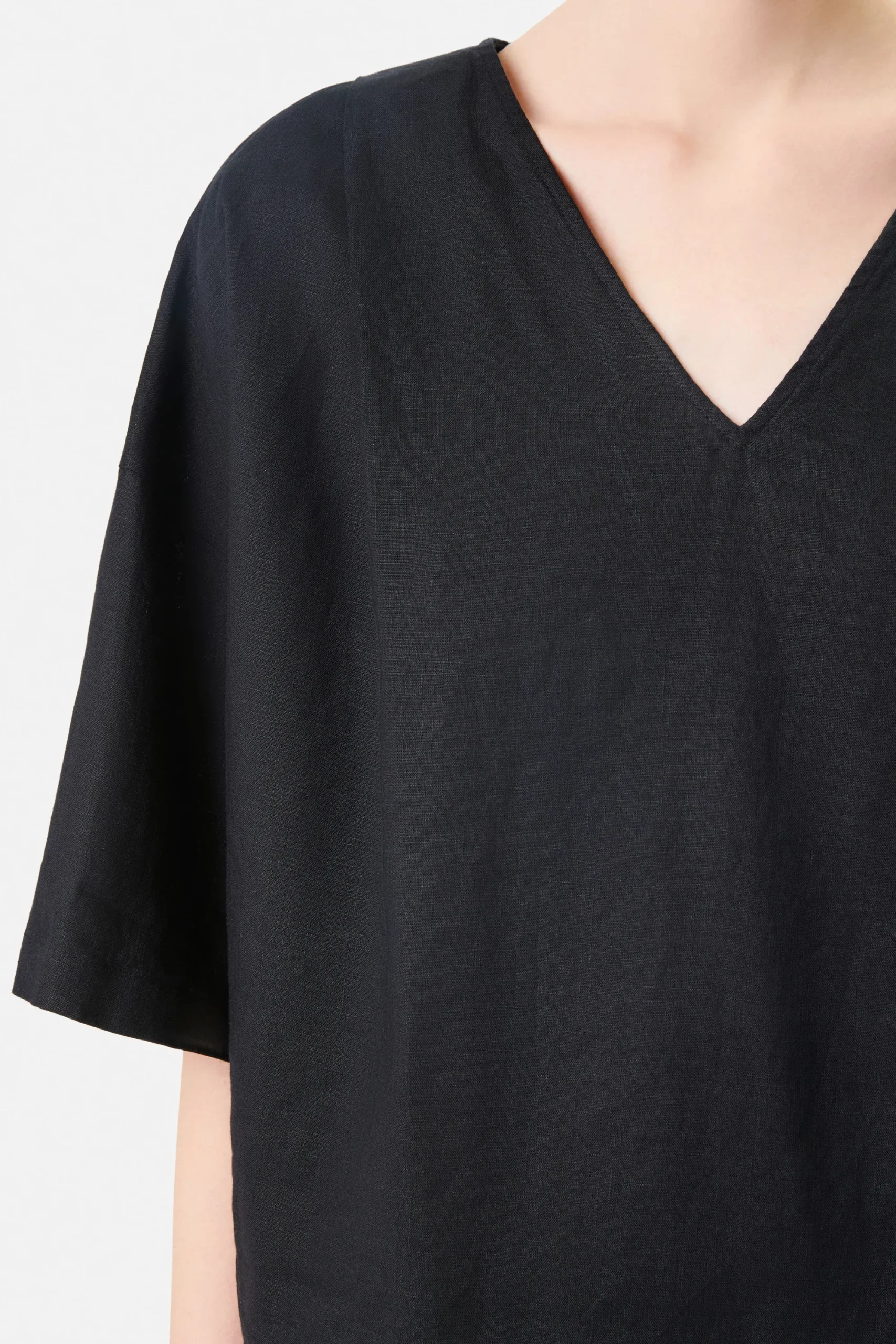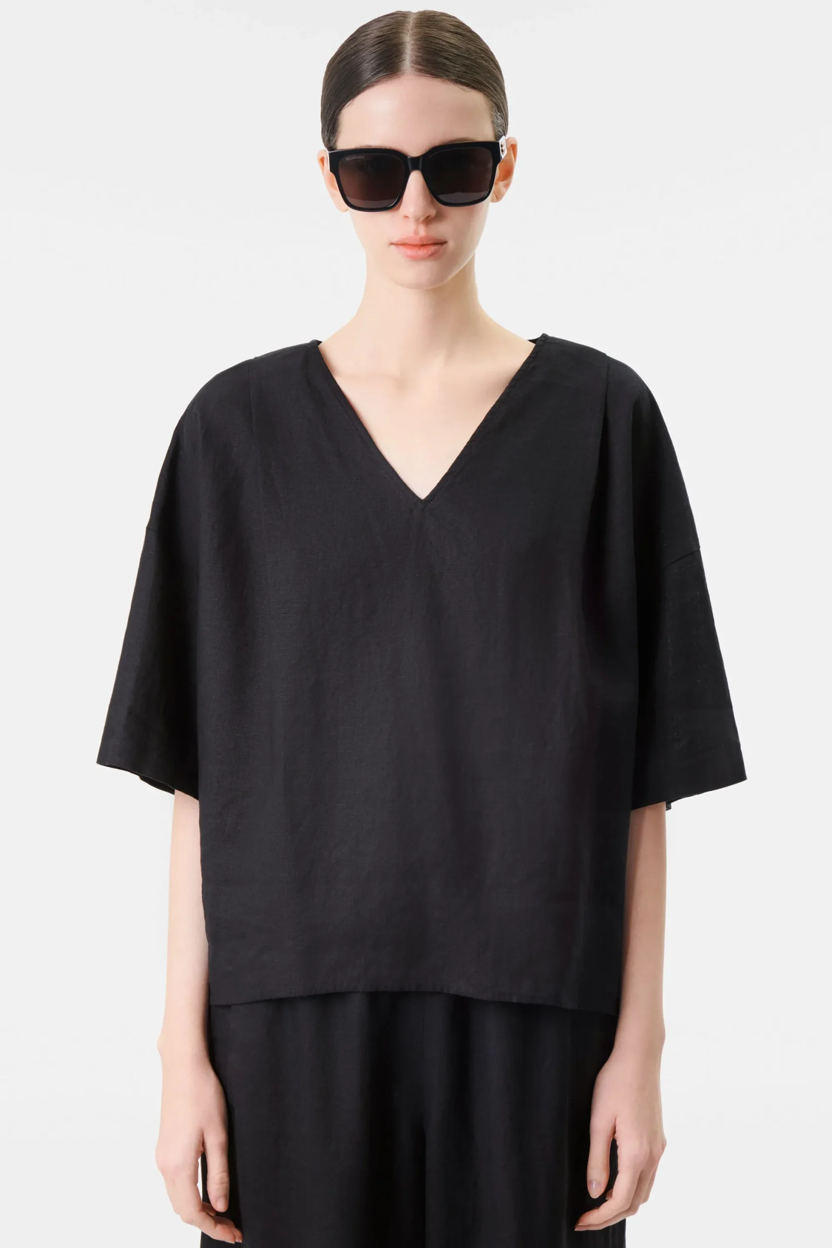 VYNI is een boxy overhemdblouse met een V-hals in een relaxte pasvorm. De bijzondere details zijn de diepe plooien voor en achter en splitten in de zijnaad. VYNI is gemaakt van zomers linnen.