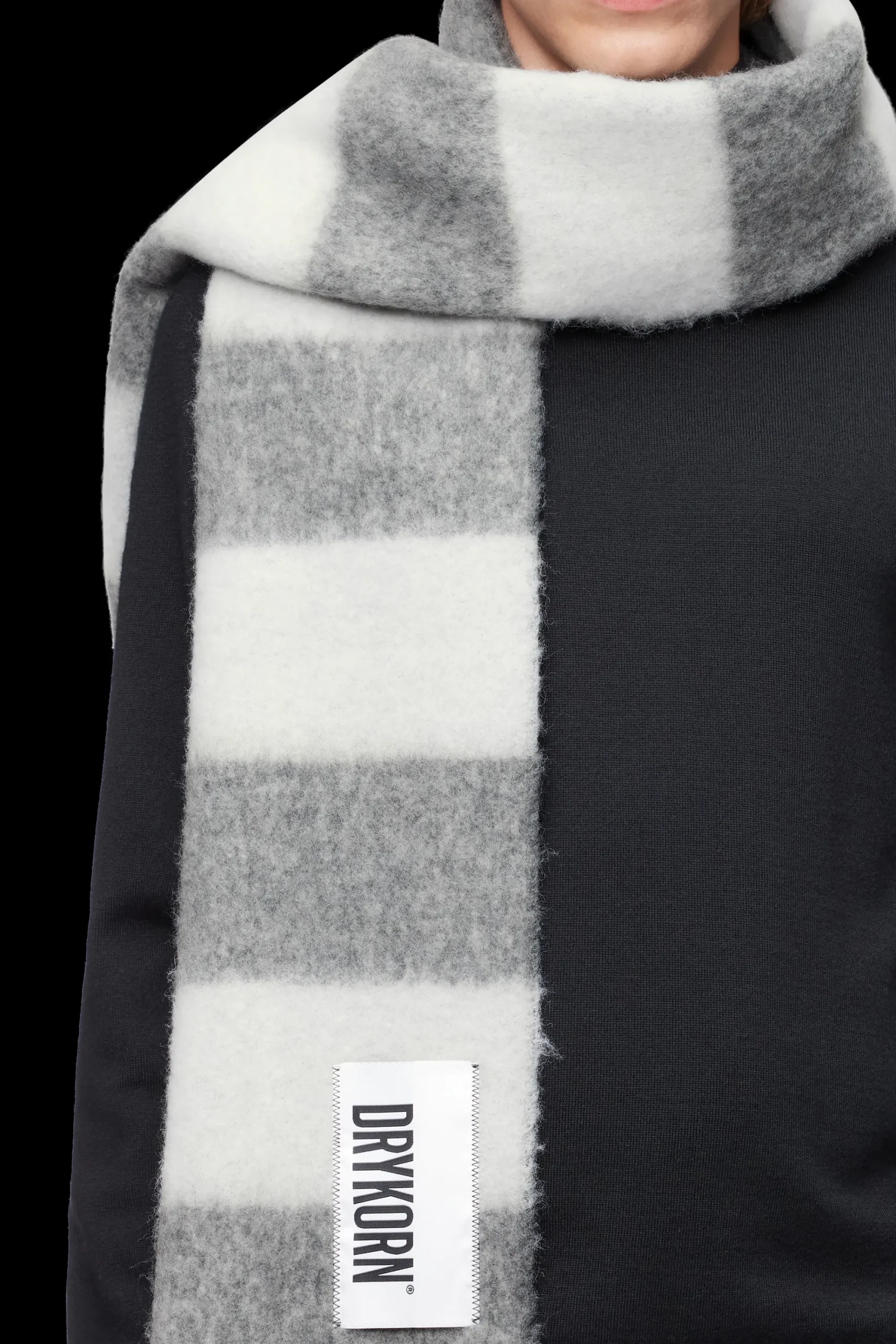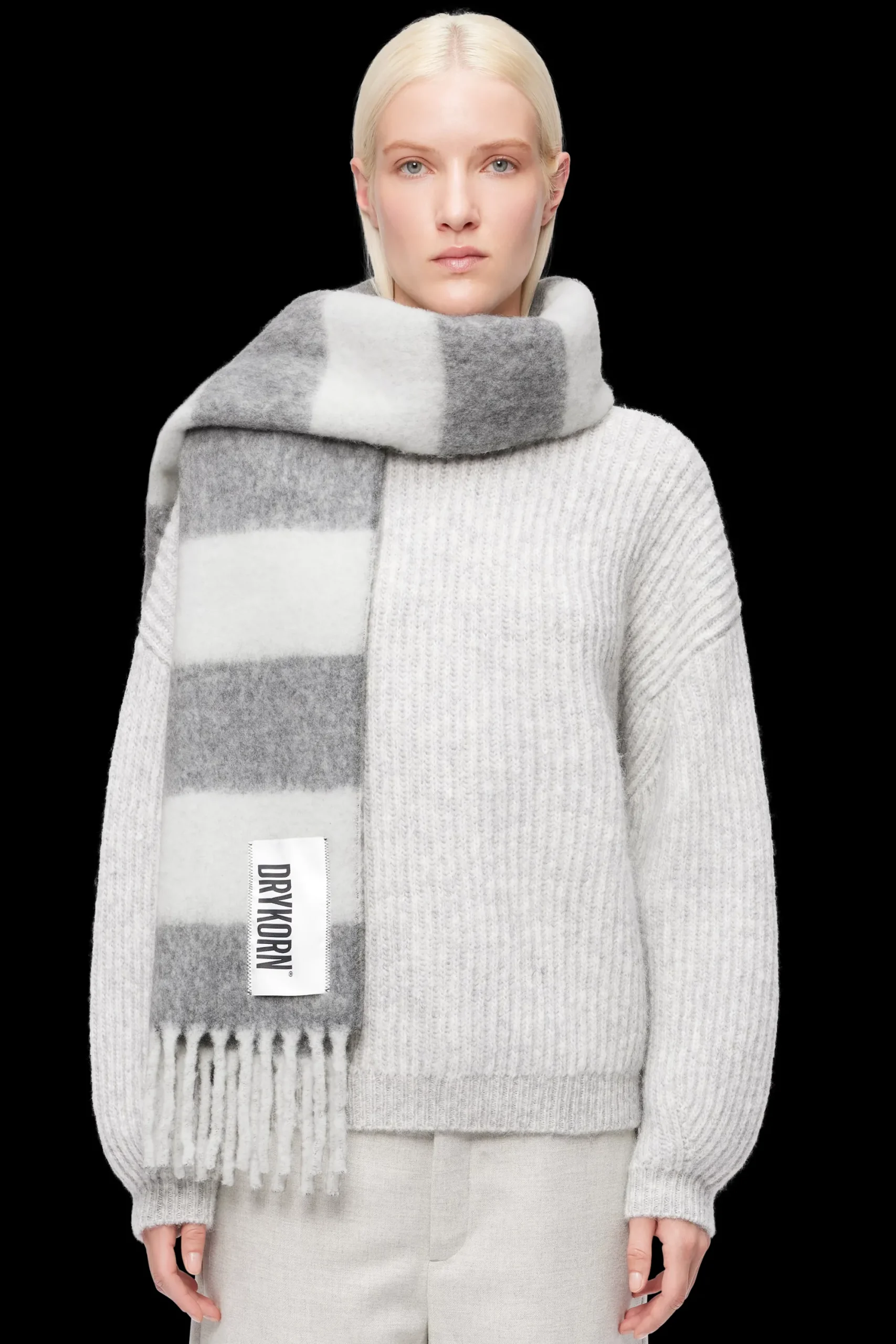 HUMALA is een klassieke sjaal met ons kenmerkende DRYKORN logo en franjes. De wolmix met blokstrepen is donzig en warm.