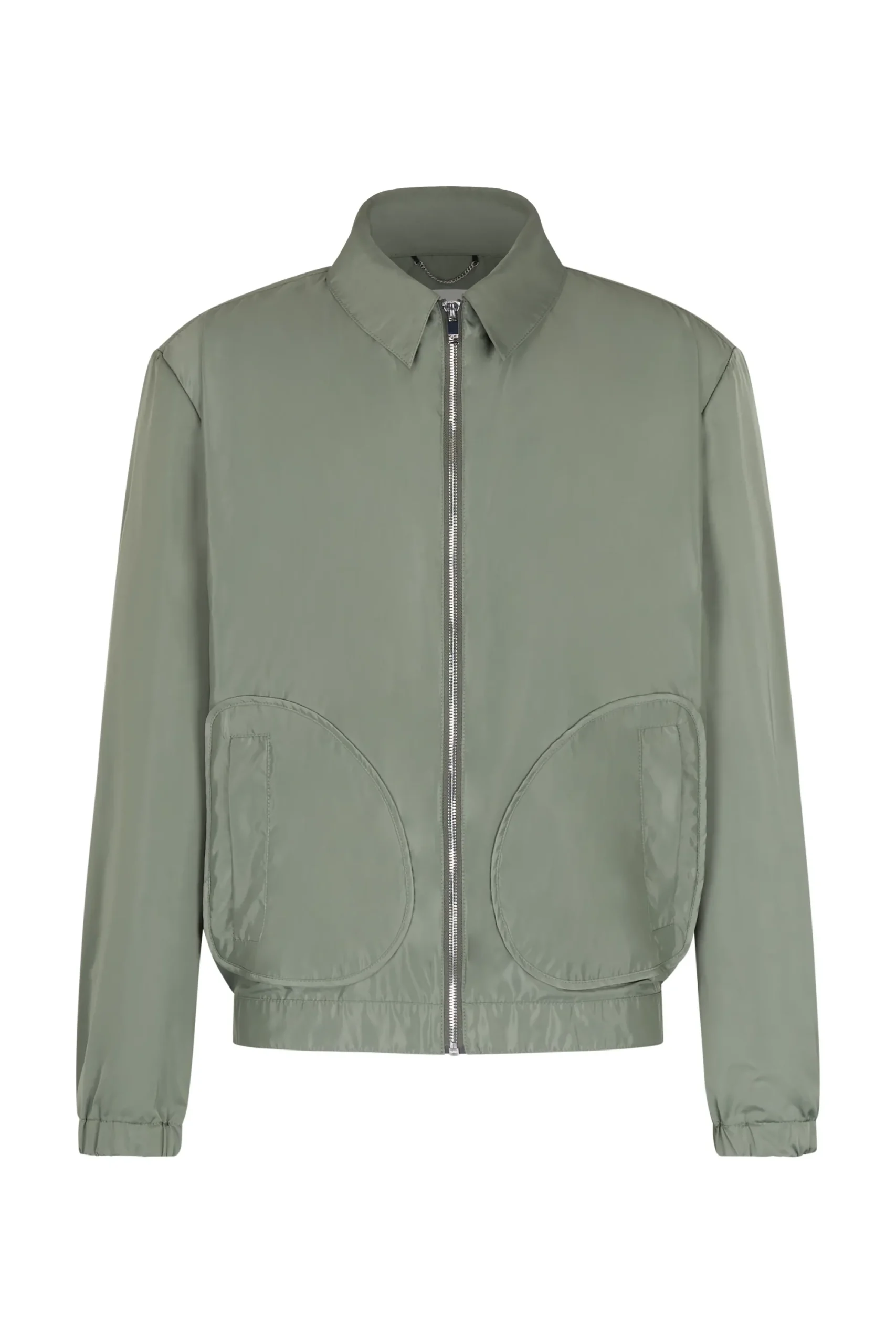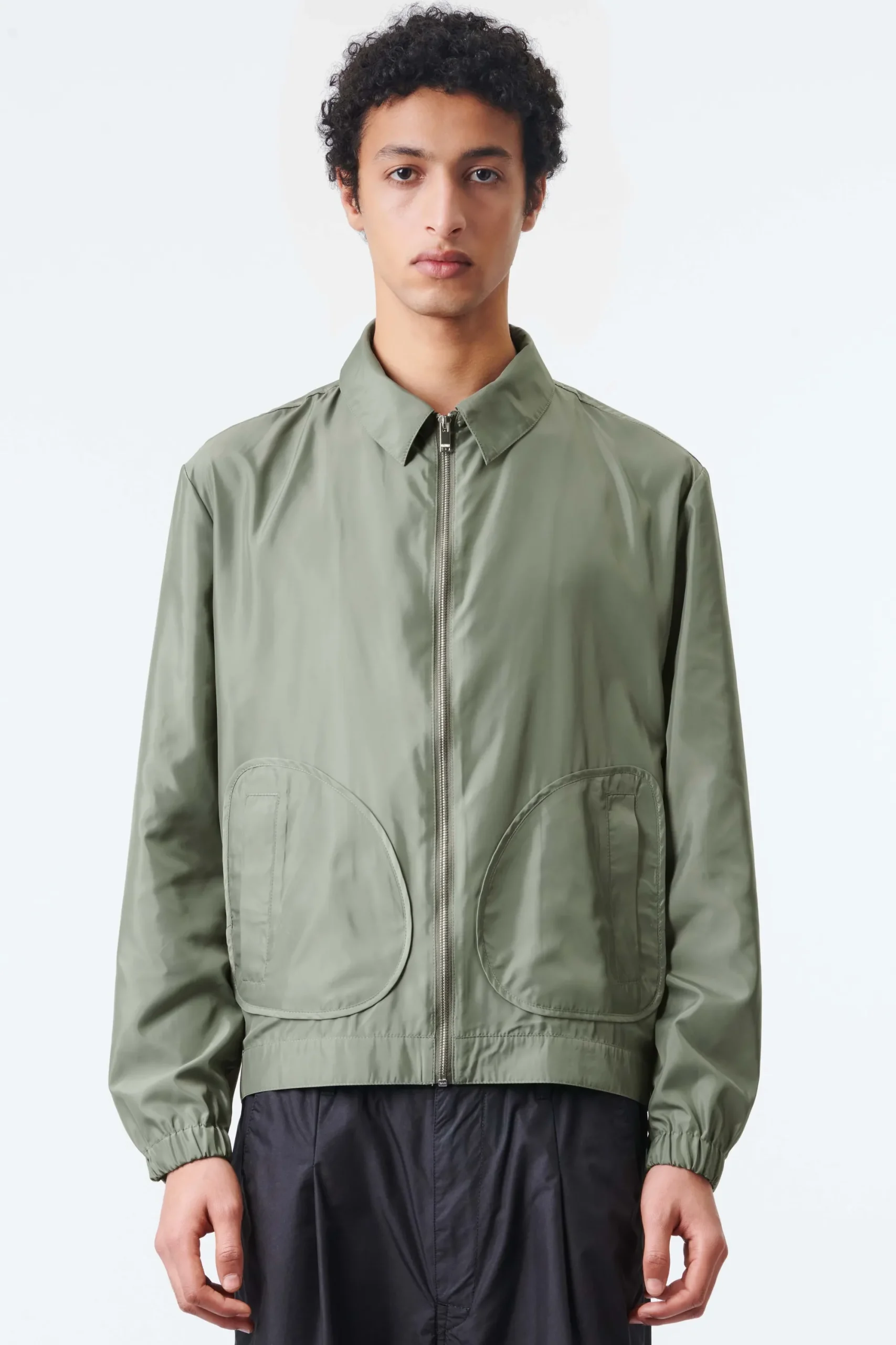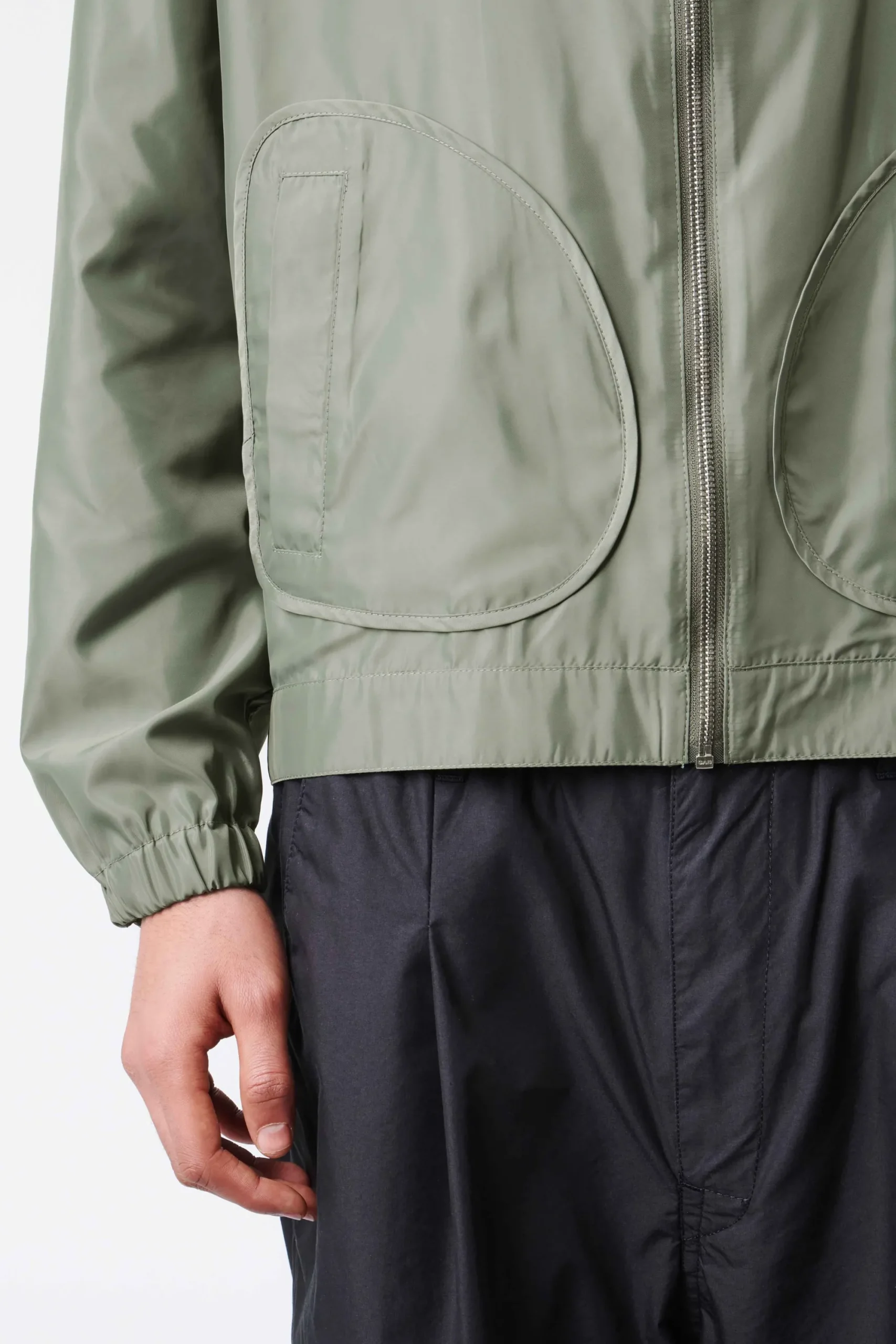 KARLONA is een blouson met een omgeslagen kraag en opgestikte, militair geïnspireerde zakken. Het bijzondere detail is de ronde zakvorm en de elastische manchetten op de rug. De vloeiende satijnen look voelt zacht aan.